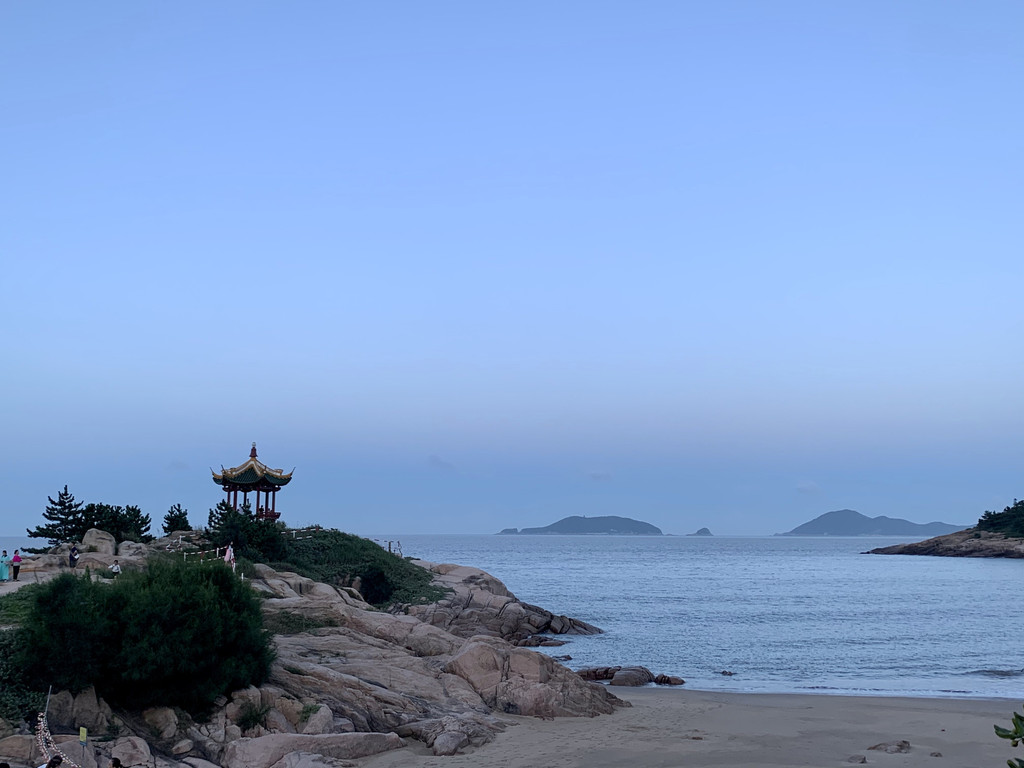 大部分时间,我在酒店呆着,或者去海边走走。千步沙上早起还是可以发现不少贝壳,海水在日光之下还是很蓝很美,不过太阳真的很厉害,怕晒可以打个防紫外线的伞,不然不多久一定晒黑。百步沙的傍晚非常美好,六点普济寺谢客后可以来吹吹风