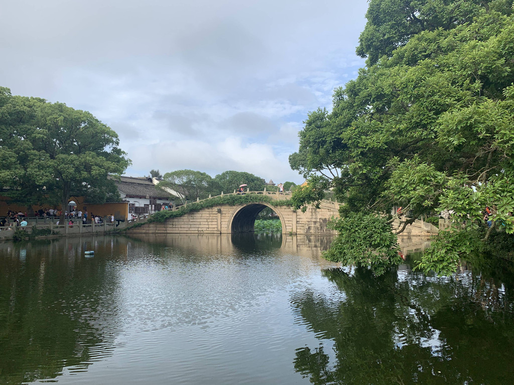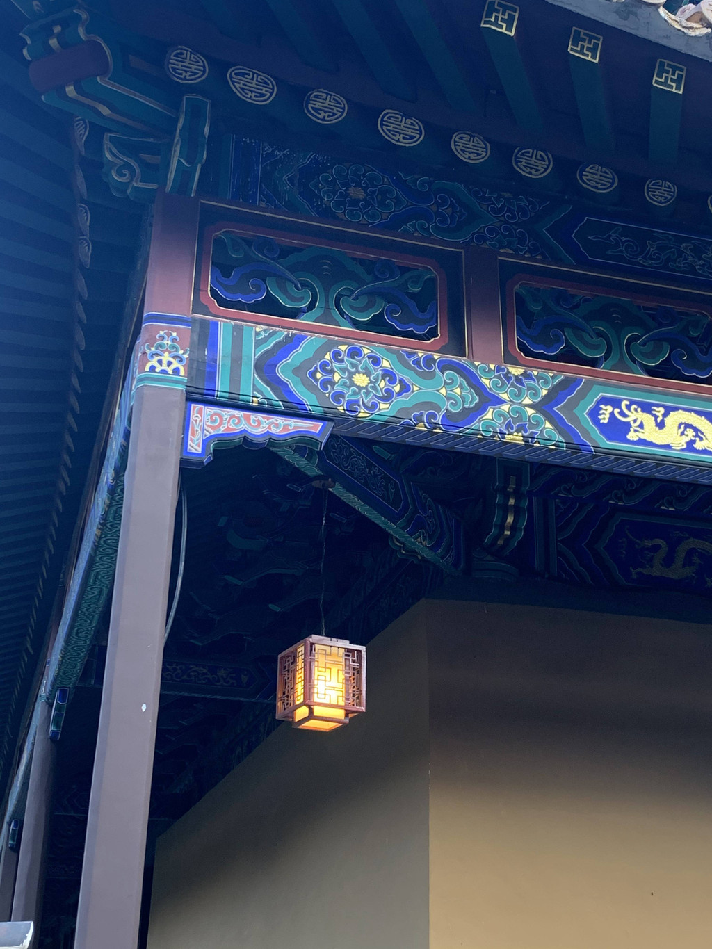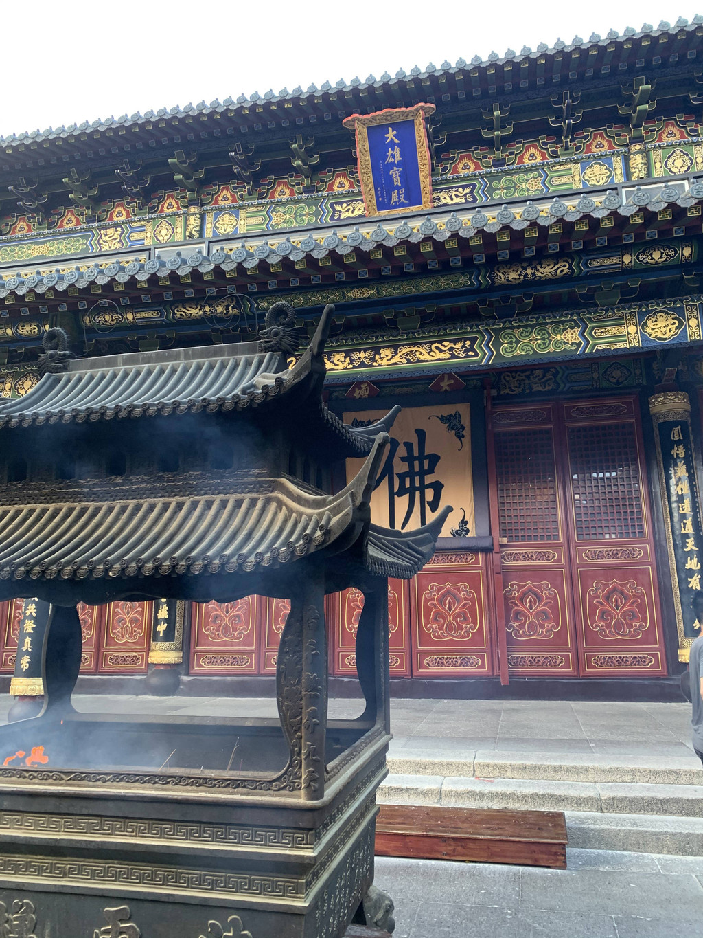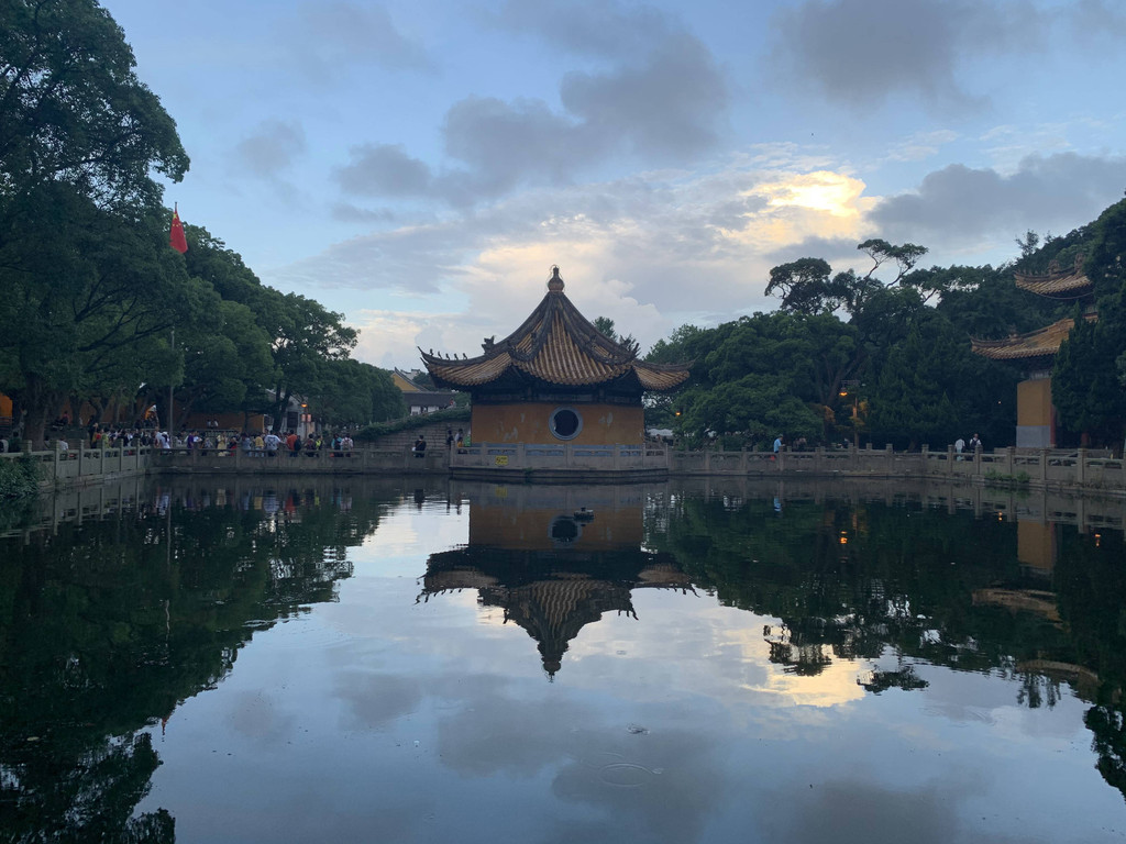 缆车下山,去了普济寺。普济寺门口有一片很大的荷花池,池上有三座桥,各有风格,接近傍晚在晚霞之下非常美好;此去恰逢法事,僧人和一众信徒虔诚诵念,整整一个多小时,我随之跪拜片刻后在院内的长椅上坐着聆听,远远地看着他们在大殿环绕诵念。接近晚上,游客渐渐地少了,寺院逐渐恢复宁静的状态,很平和。
