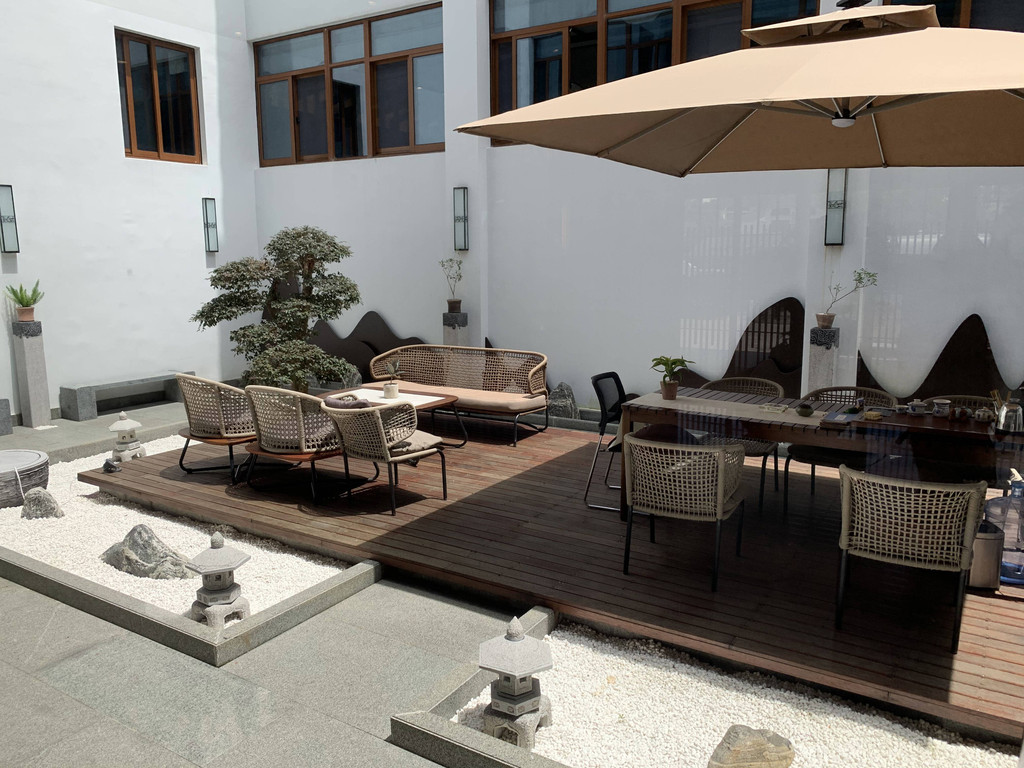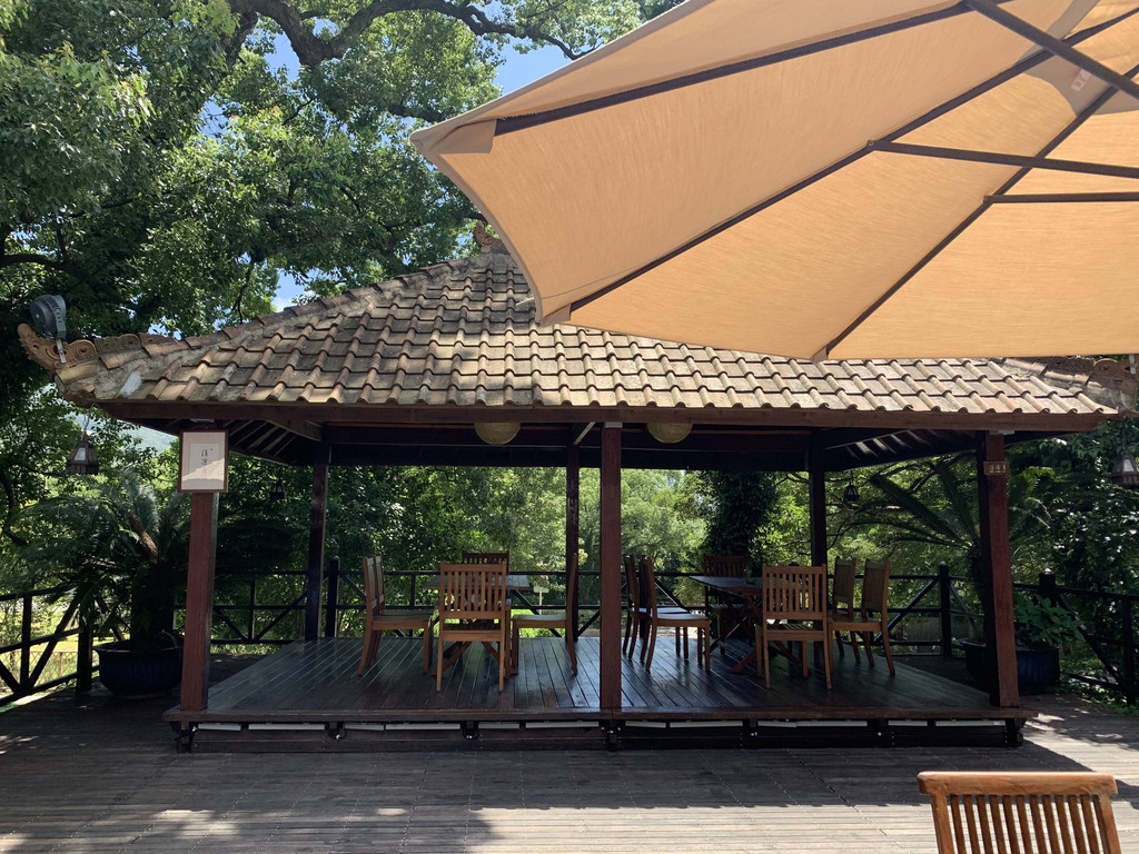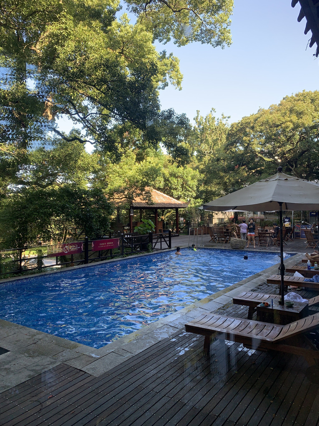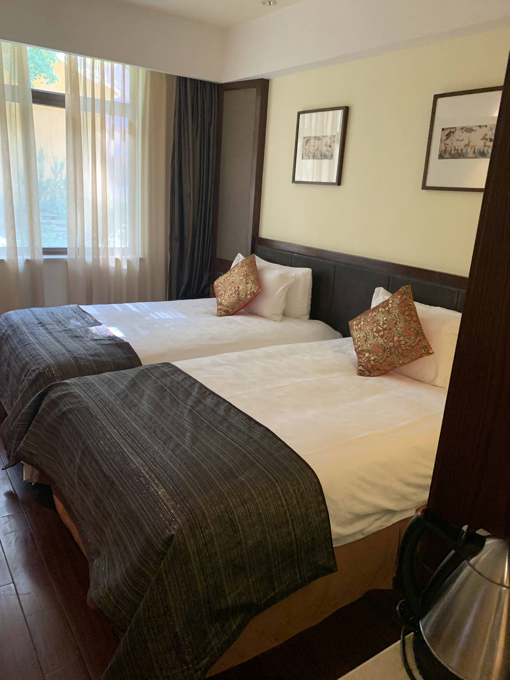 普陀山岛上没有出租车,都依靠公共交通,所以在交通最为方便的酒店里选择了比较成熟的禅意雷迪森酒店;出门走几步路就是公交站,在千步沙对面,还配套了一个小型户外泳池,在这个海岛上算是很奢侈了。泳池上方依然是古树遮荫,,所以不会太晒,每天都有很多小朋友在里面嬉水。酒店自己配套的餐厅可以通过官方微信购买打折优惠,早餐在这个岛屿上还是相对丰富的,感觉这个建筑也是以前的寺院改造的,走廊曲曲折折的,四楼的房间还有一个台阶,但是内部房间配套还不错,床垫很合适,睡得很好。喜欢入住时候的伴手礼,两串木质佛珠,朴实优雅;洗手间还有一个泡脚木桶,有一次性的泡脚袋和浴盐,在外行走一天,泡泡脚还是很舒适的。
