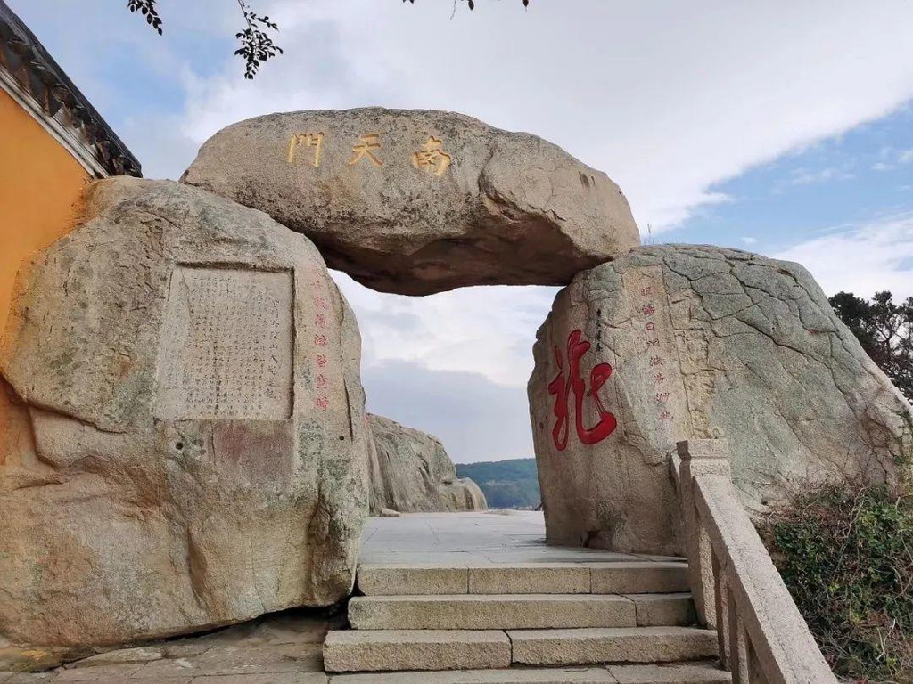 沿着石路登山不久,就看到了南天门。两块巨石壁立如门,上有条石横亘,额题“南天门”。门内岩群丛秀,摩崖石刻丰富,穿门而过,可看到碧海浩渺,景色壮美。