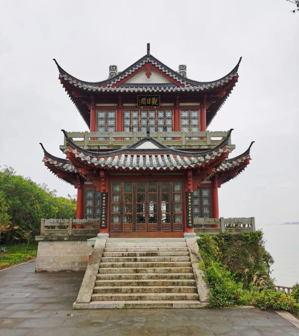 观日阁,顾名思义,这里是普陀岛东面临海处晨观日出的地方。此阁端庄典雅,古色古香,风光旖旎,凭栏观海,不胜快哉。