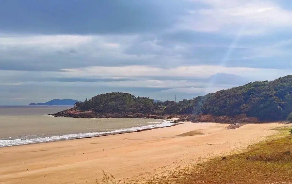 朝阳洞左右挽百步沙与千步沙,朝北望去,就是宽广绵长的“千步沙”——普陀山十二景之一。此时云缝中漏下一缕阳光,照在海岸分界线、沙树交汇处,蔚为奇观。