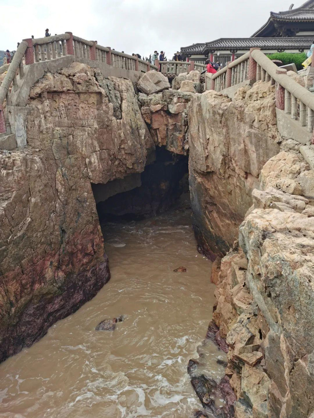 澹澹亭一旁有座大士桥,跨过小桥下至海边,看到了嶙峋怪石所围的潮音洞。