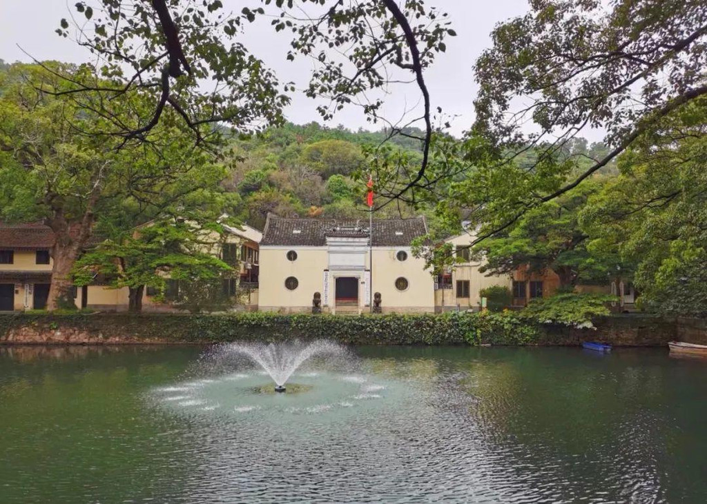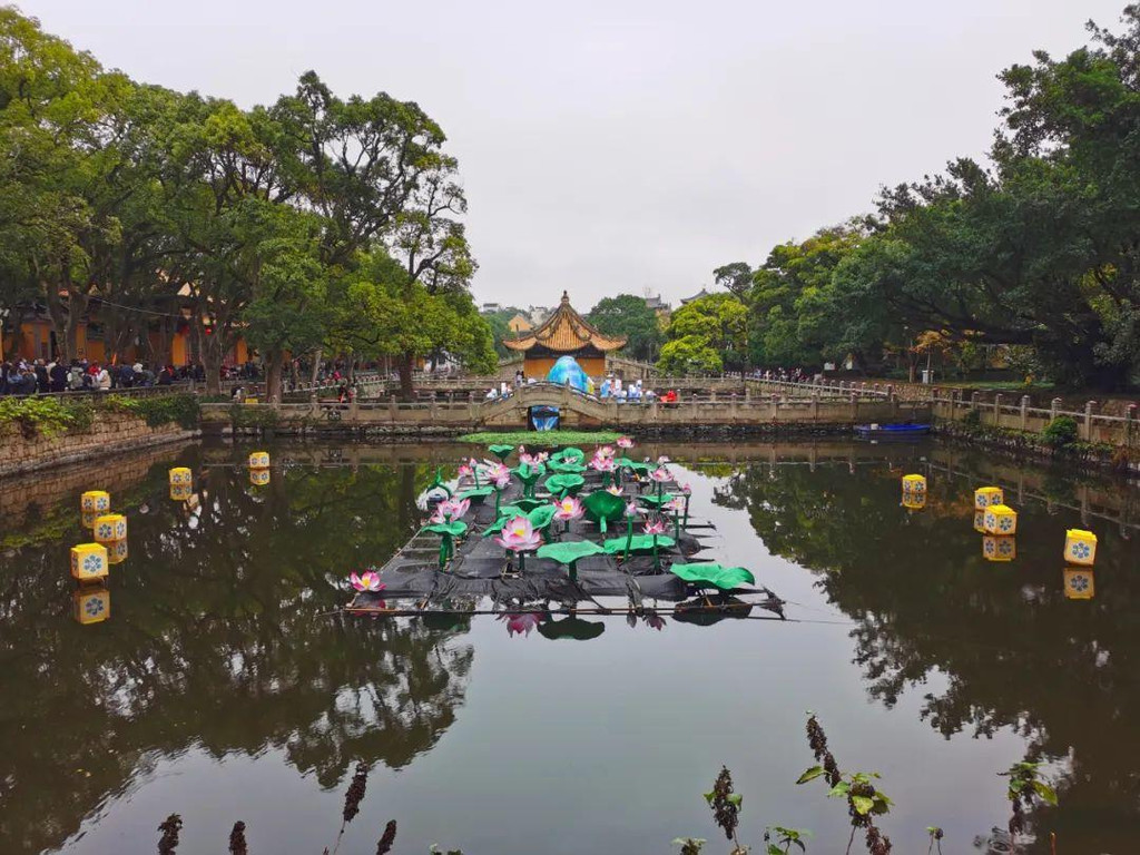 再往前,看到一池翠木环绕的湖水,水边有肃穆幽深的禅院,便来到了普济寺景区。