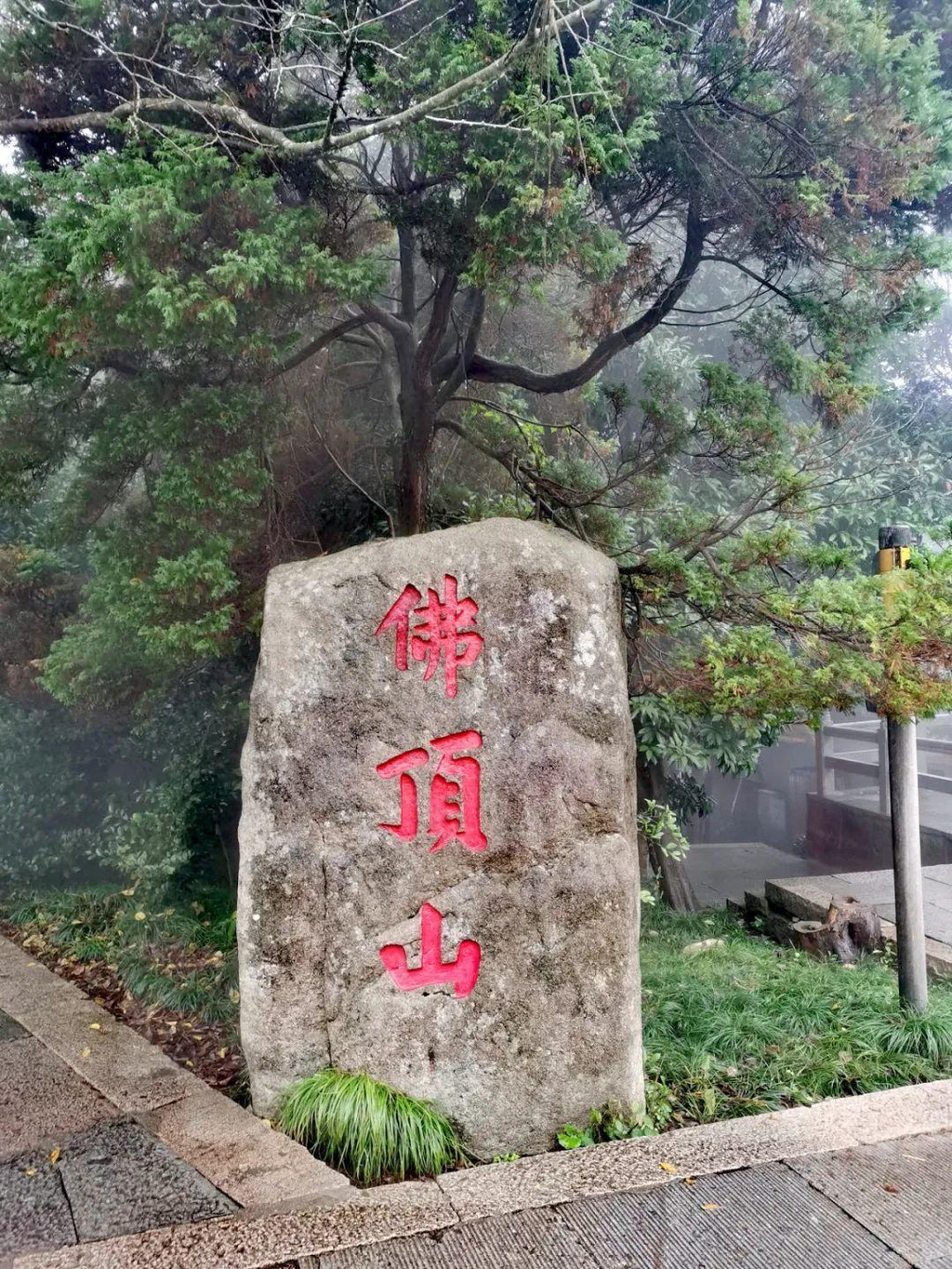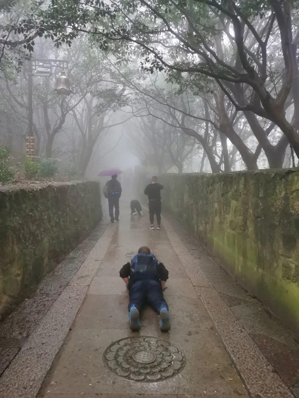 登山途中下起了雨,雾越来越大,及至登上山顶,能见度已不过十多米。山路异常辛苦,但有的信徒竟五体投地跪爬上来,让人钦佩。