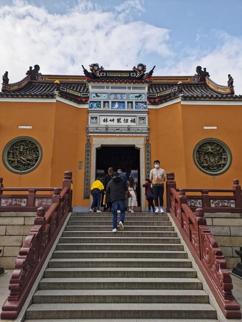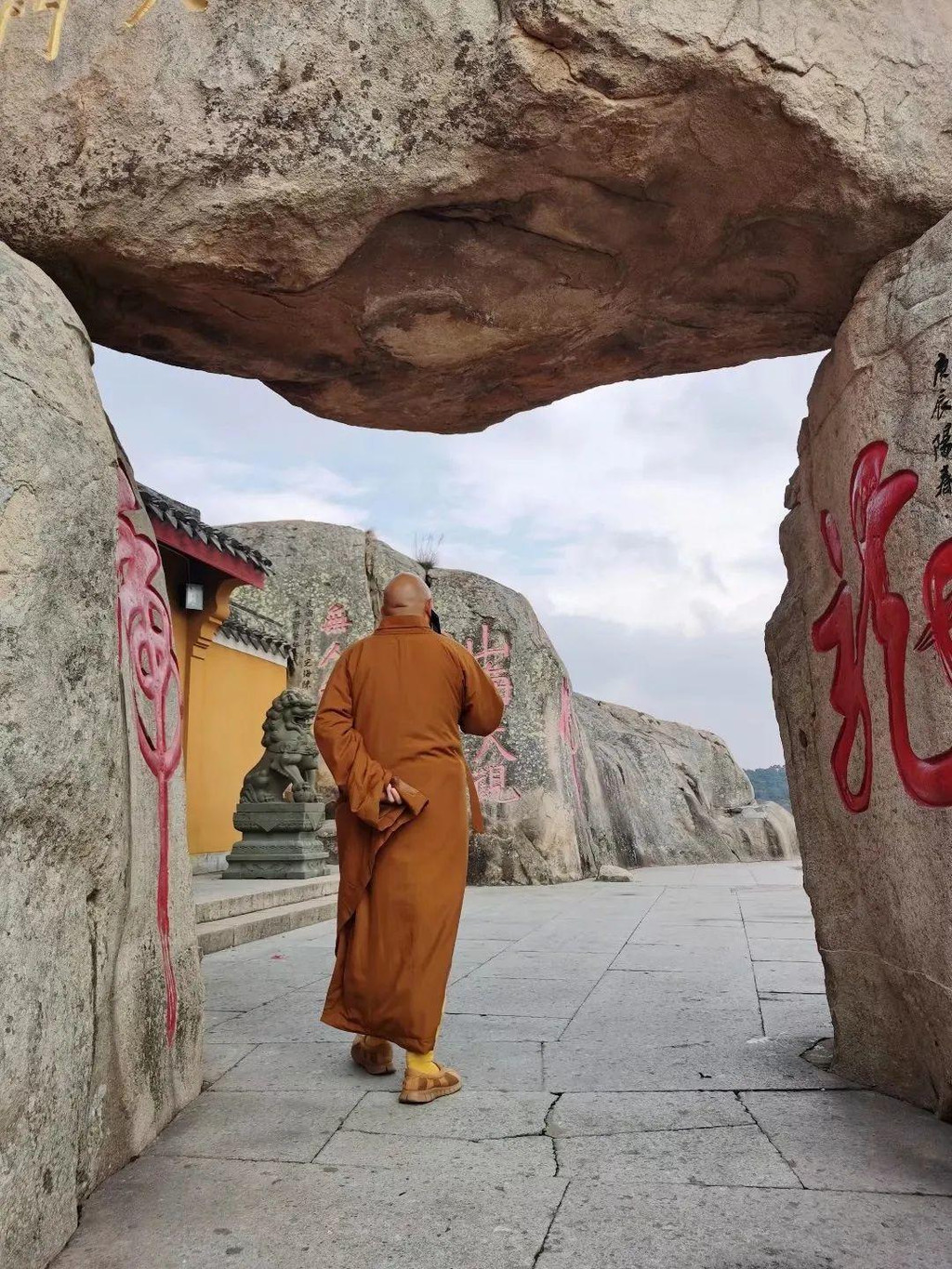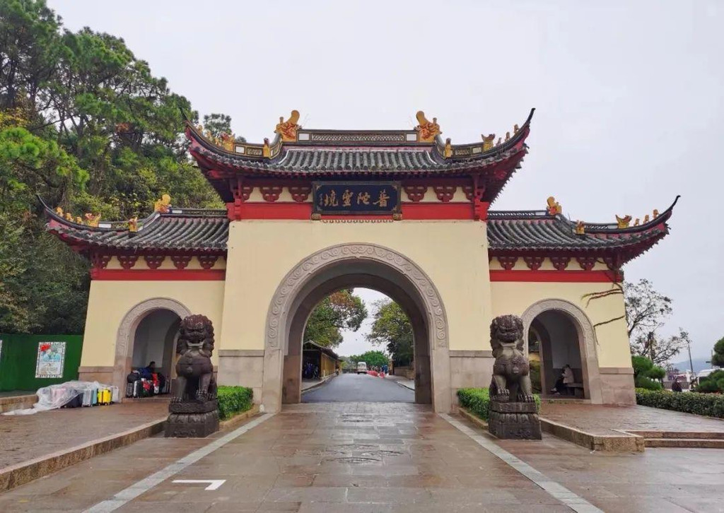 穿过仙境,看到一座雄伟的牌坊,上书“海天佛国”四字,牌坊后终于来到法雨禅寺。
