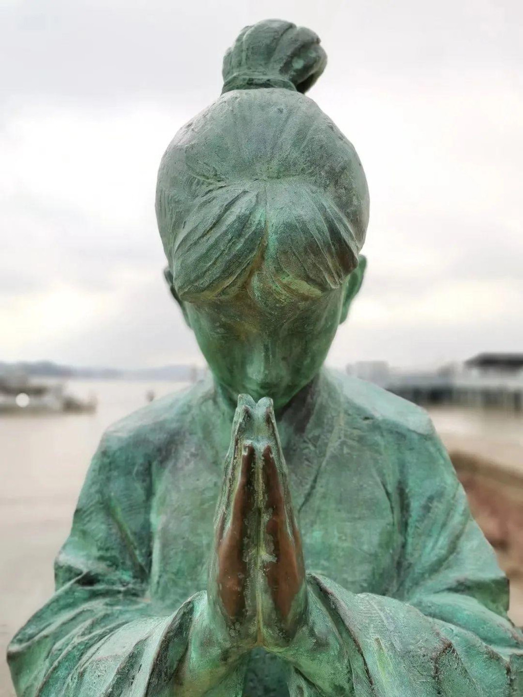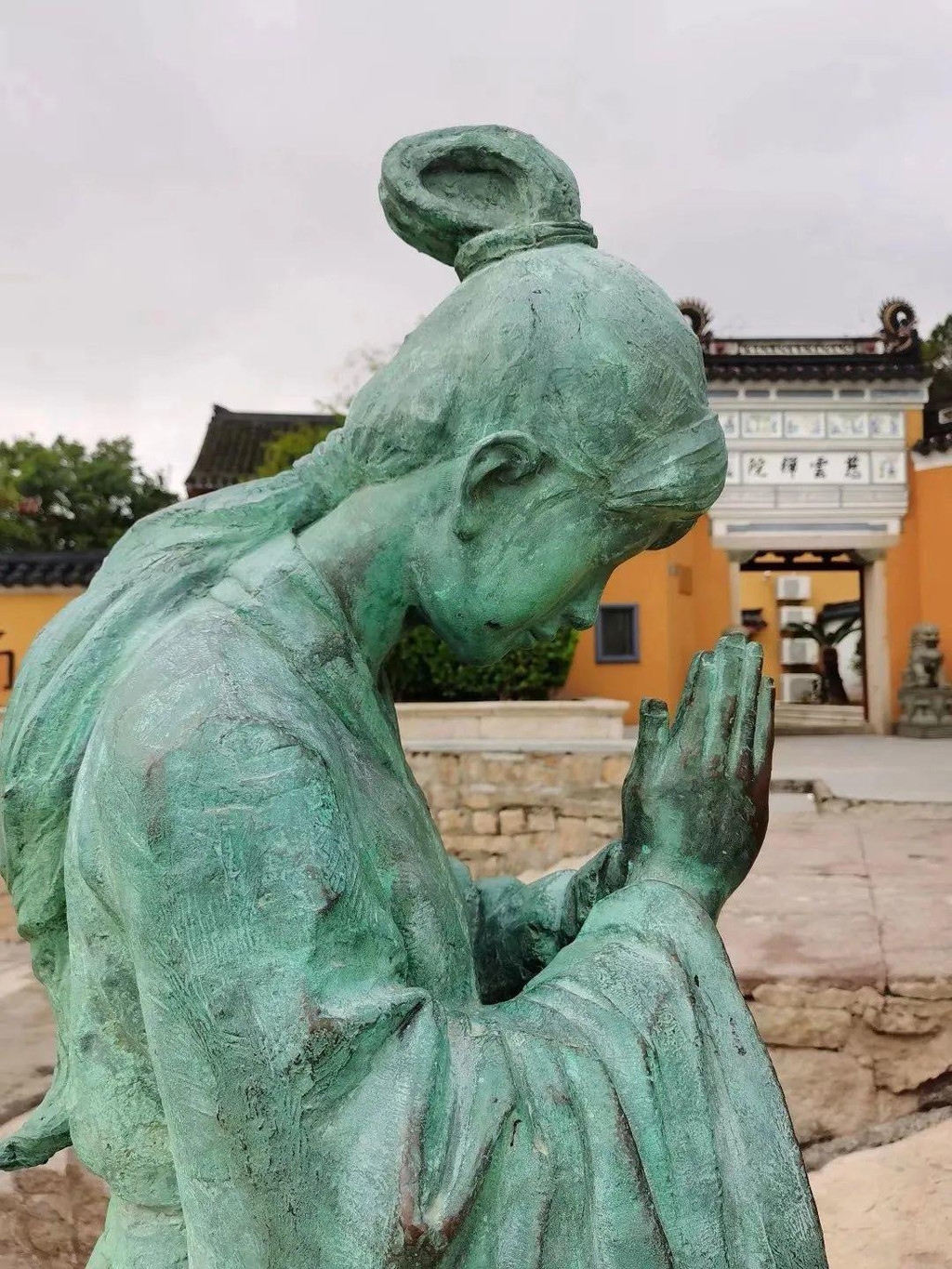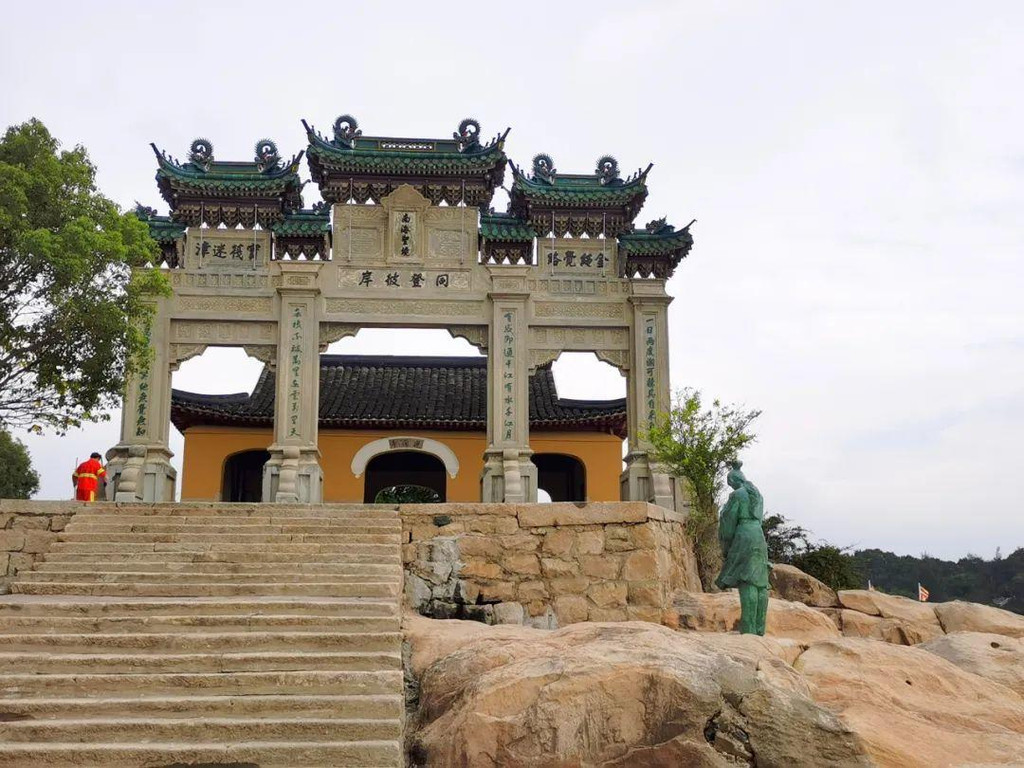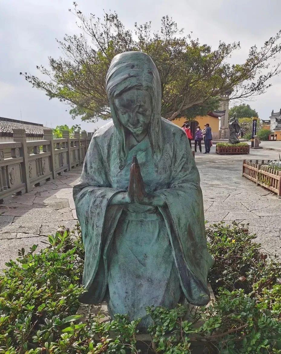 转完南天门,普陀山之旅也接近尾声,在码头附近慈云禅院外、南海圣境牌坊下,一座少女的雕塑吸引了我的注意: