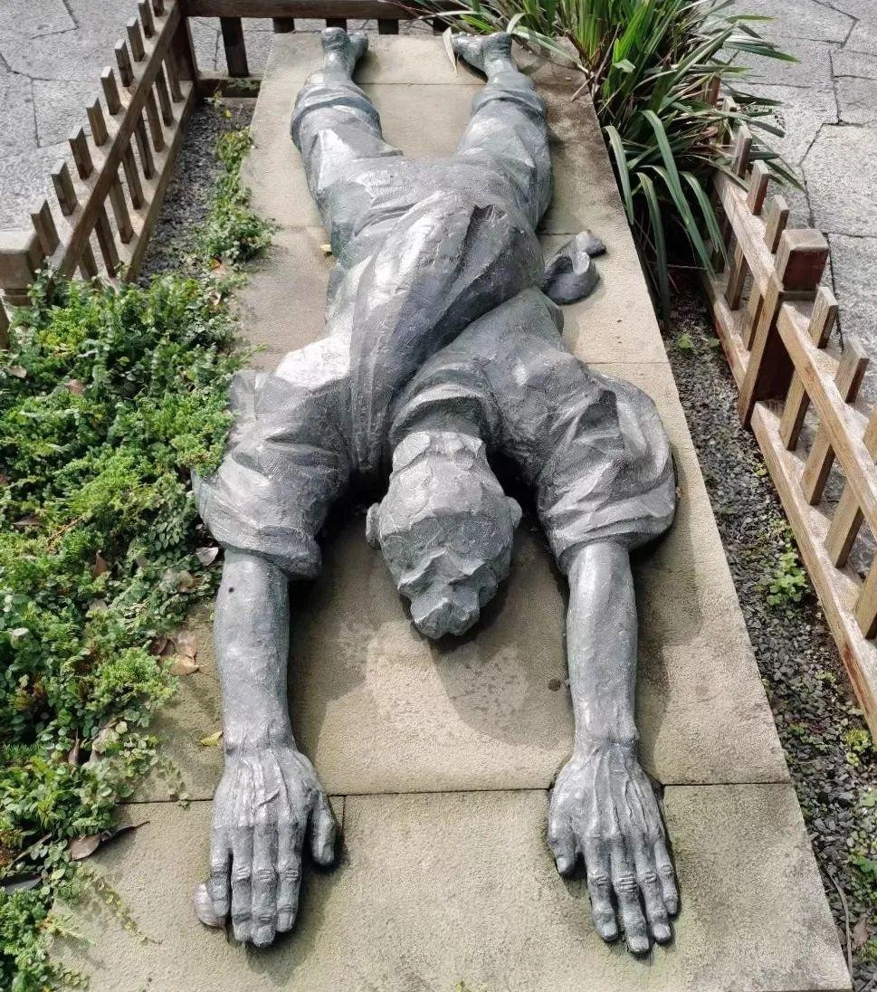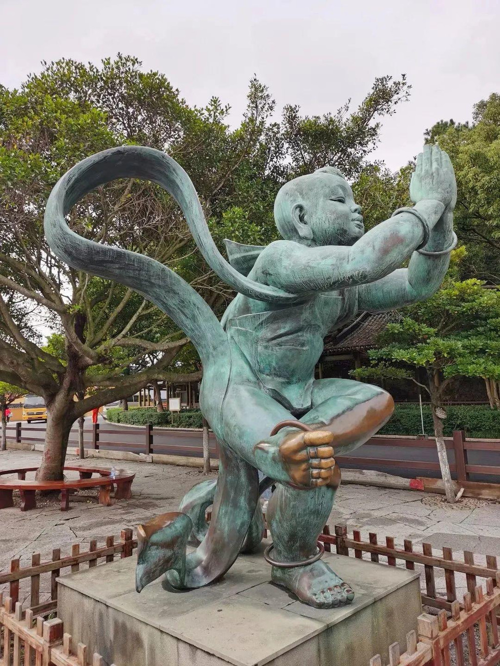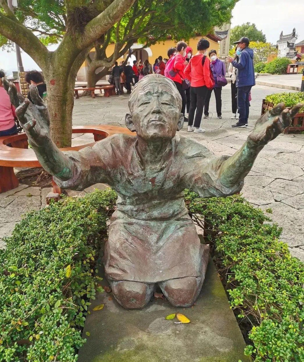 转完南天门,普陀山之旅也接近尾声,在码头附近慈云禅院外、南海圣境牌坊下,一座少女的雕塑吸引了我的注意: