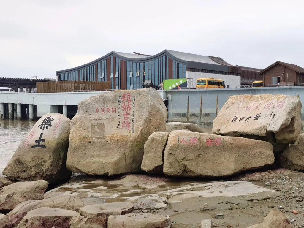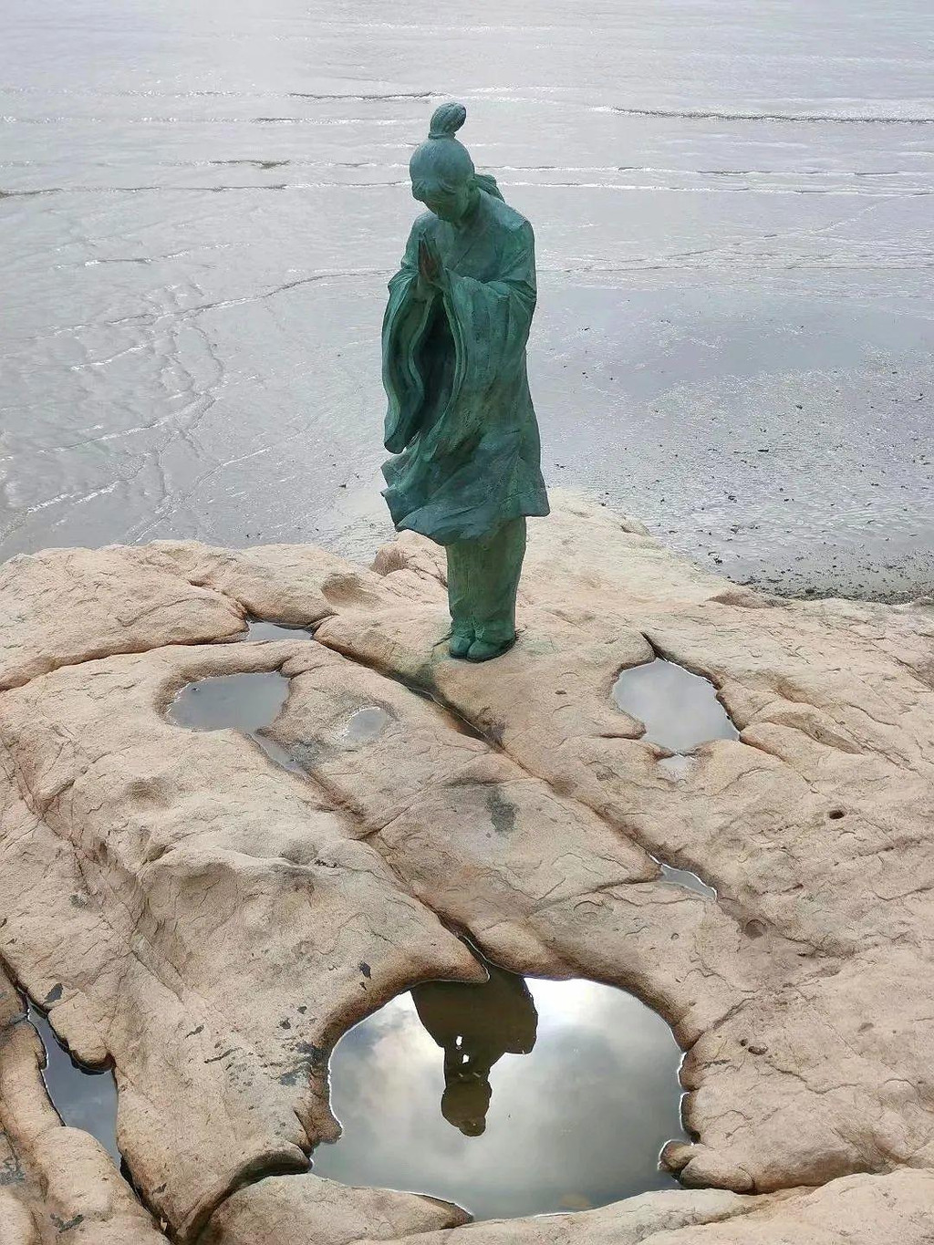 这也是一个有故事的女孩:相传古时有姑嫂渡船来普陀进香,船靠岸时,小姑天癸来潮,不敢下船入山,嫂短其姑无福朝圣,便独自进山礼佛。午时潮起,一村妇向海里投石铺路,为小姑送来饭菜,嫂后感悟观音大士显身行善,自惭无缘。自此,姑嫂泊舟处称为“短姑道头”,此处雕塑即为短姑胜迹。