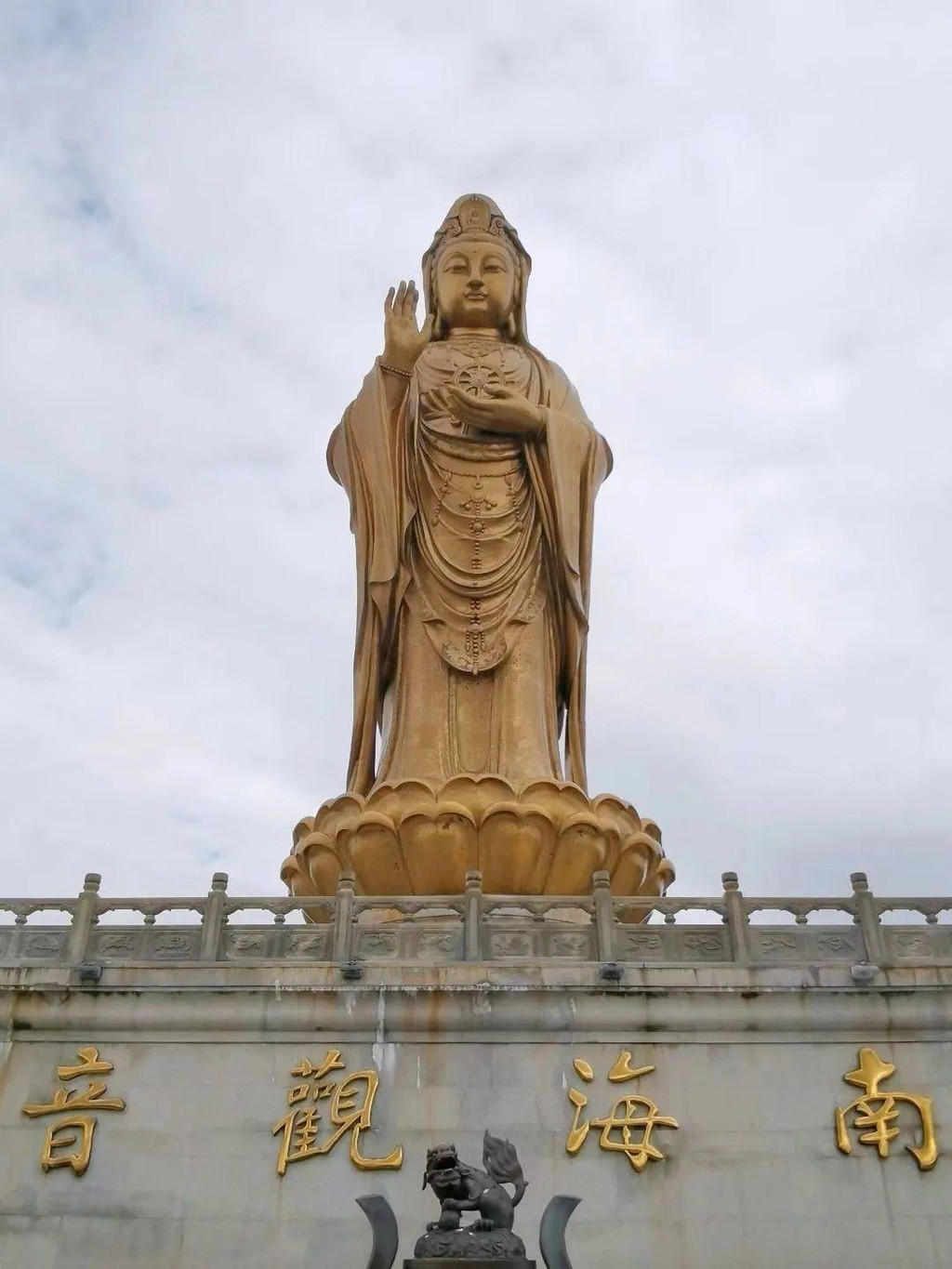 进入门阙,终于看到了这座观音立像。在三亚南山也见过一尊观音立像,说实话,要比眼前的观音更加壮观,三亚的观音高108米,比自由女神还高15米,而眼前的观音只有33米,台基还占了13米。然而,来这里拜观音的游客可比三亚多多了。