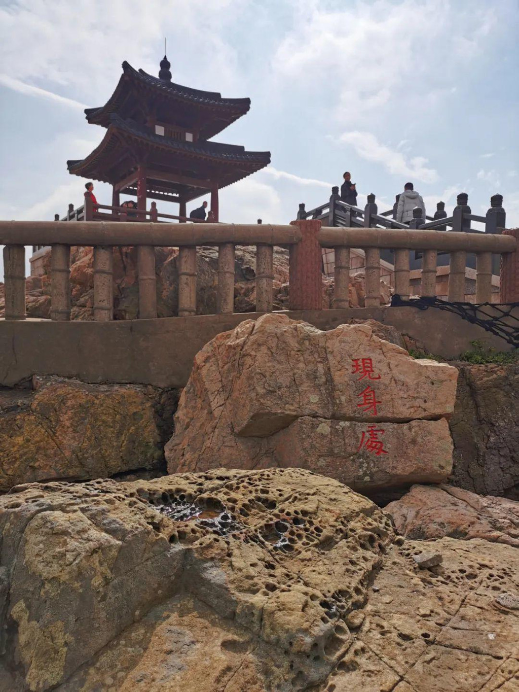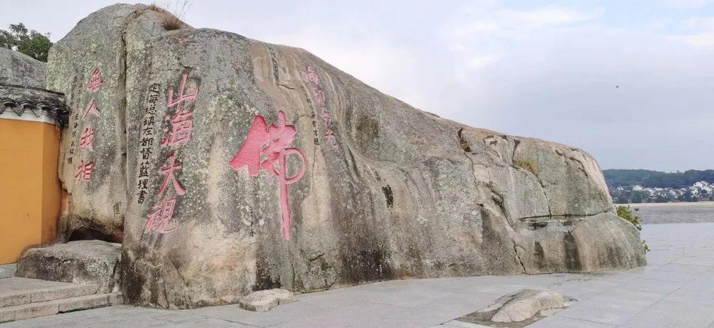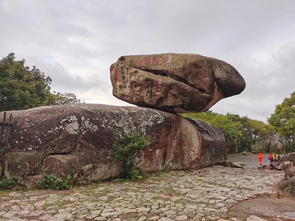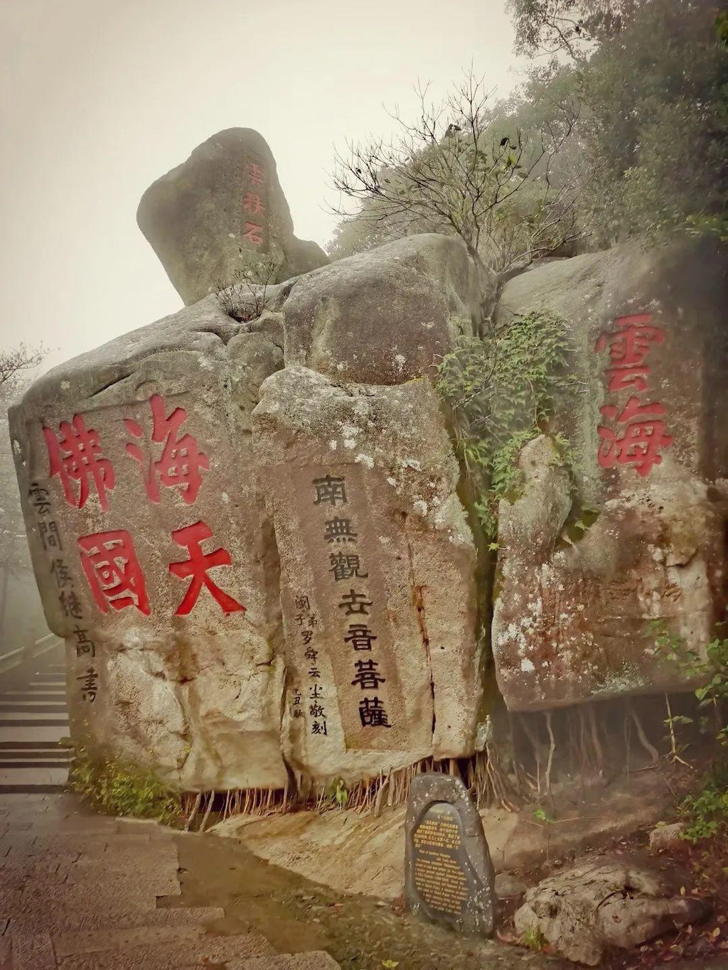山上看到了普陀名景——海天佛国崖和云扶石。“海天佛国”是明朝抗倭名将侯继高所书,由于这四个字概括了普陀胜境的特色,便成了普陀山的代称。巨石上累一小石,卓立不下坠,常有云雾缭绕的景象,古称“云扶石”。