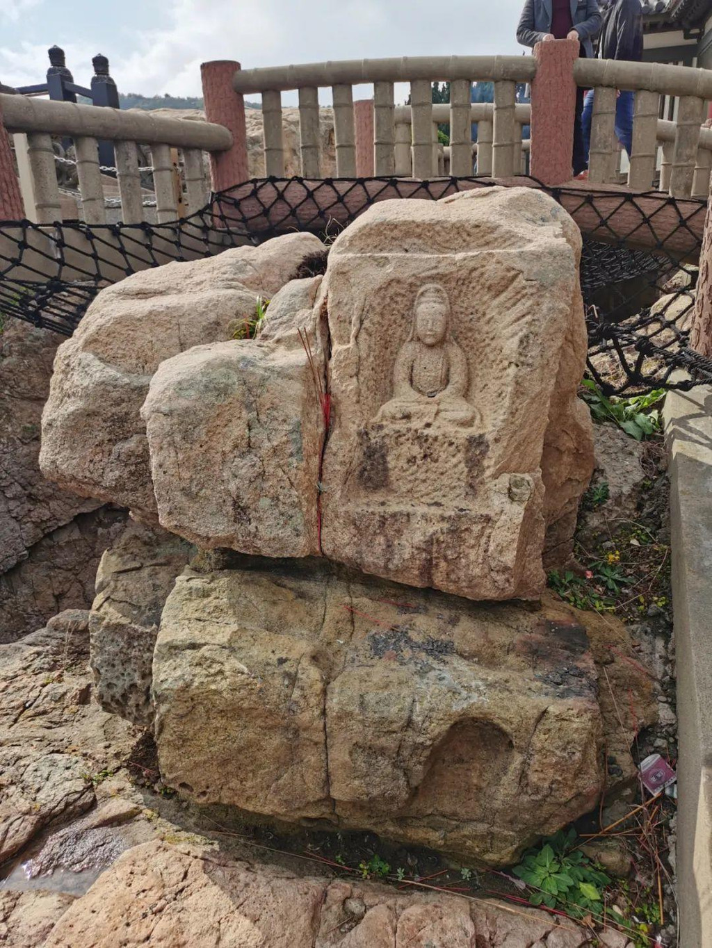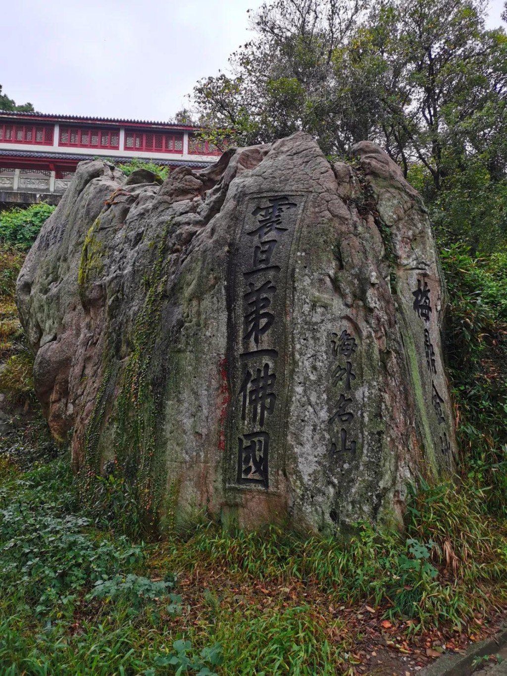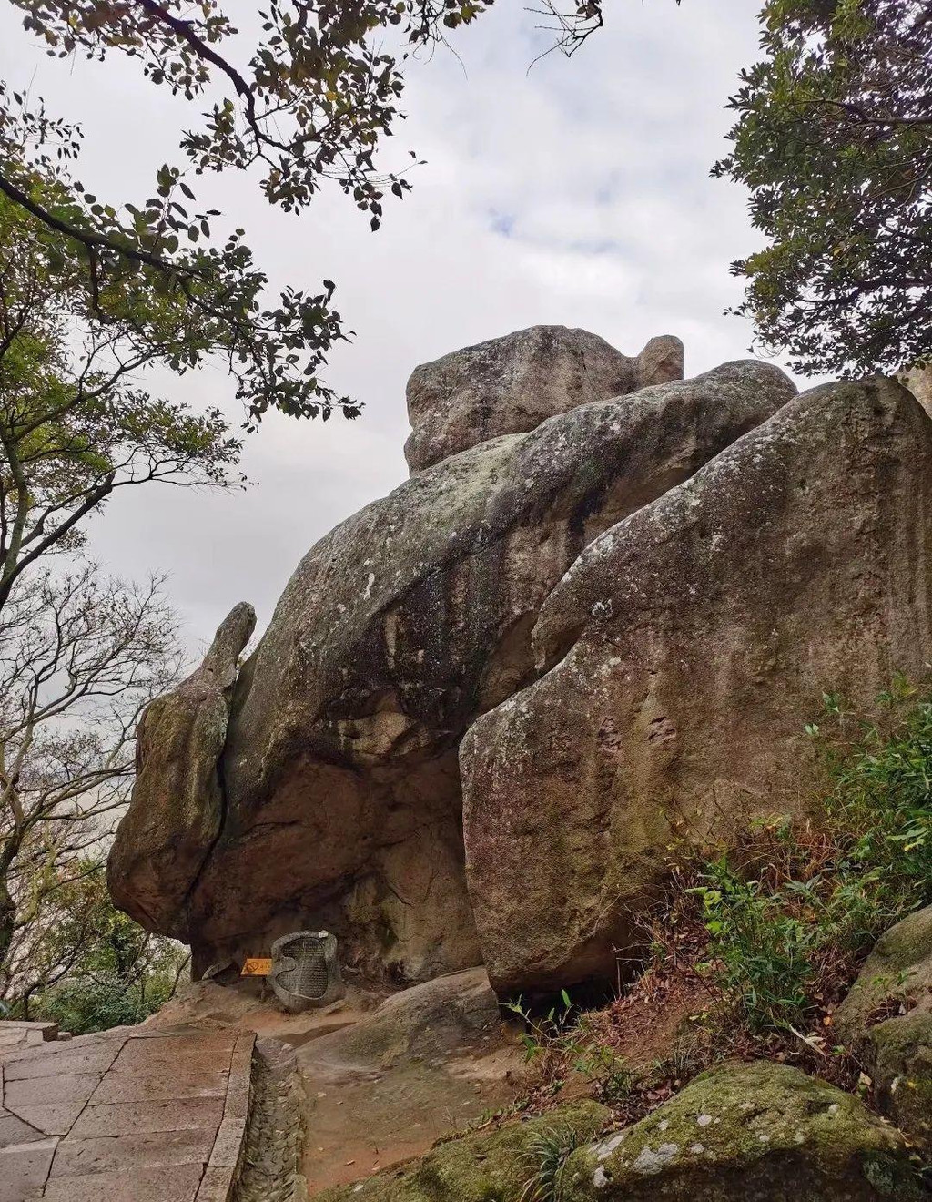 山上看到了普陀名景——海天佛国崖和云扶石。“海天佛国”是明朝抗倭名将侯继高所书,由于这四个字概括了普陀胜境的特色,便成了普陀山的代称。巨石上累一小石,卓立不下坠,常有云雾缭绕的景象,古称“云扶石”。