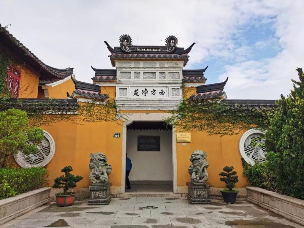 观音立像不远处是西方庵,又称“西方净苑”,为民国初僧福升创建。寺内圆通宝殿中供奉着汉白玉雕观音菩萨像,两壁有彩绘长卷十八罗汉图,生动逼真,气势恢宏。