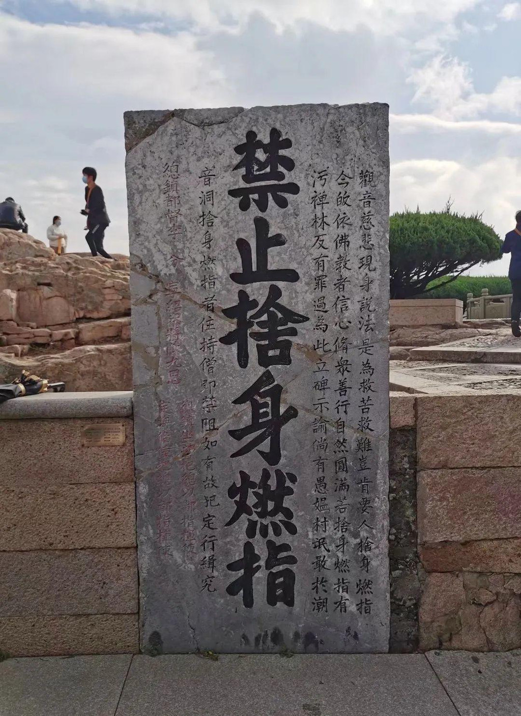 院外有座石碑上书“禁止舍身燃指”,原来明嘉靖年间,普陀山流传“舍身能成佛,燃指表诚心”的谎言,不少善男信女信以为真,到潮音洞边跳洞舍身,或在不肯去观音院前燃指,以示对菩萨的诚心,惨死或致残者不计其数。为规劝这种愚昧行为,总镇都督李分等人立了一块大石碑,正中镌有“禁止舍身燃指”6个大字,两边还镌有87个小字,上书“观音慈悲现身说法是为救苦救难,岂肯要人舍身燃指云云”。自此,舍身燃指的蠢事得到了阻止。