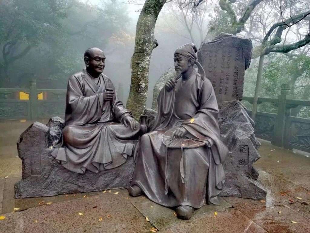 寺外有诗人陆游和禅师对谈的雕塑,陆游曾作诗《好事近(登梅仙山绝顶望海·十二之八)》:“挥袖上西峰,孤绝去天无尺。拄杖下临鲸海,数烟帆历历。贪看云气舞青鸾,归路已将夕。多谢半山松吹,解殷勤留客。”意境颇似佛顶山。