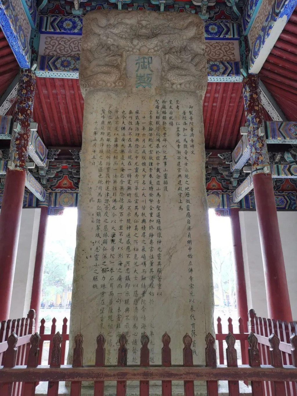 海印池上有座石桥,石桥上有座六角亭叫“定香亭”,亭中御碑一座,记录了普济寺的兴建和普陀山的历史,为清雍正皇帝所书。