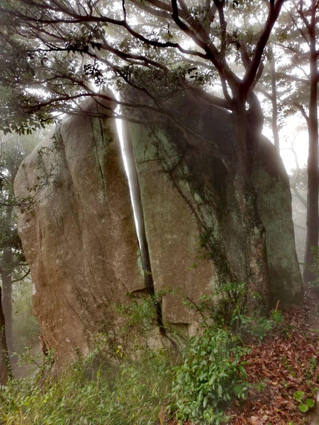 下行不久看到了刀劈石景观,这是一块崩塌的巨石,中间的缝隙是节理裂隙,宛如巨刀劈开巨石。