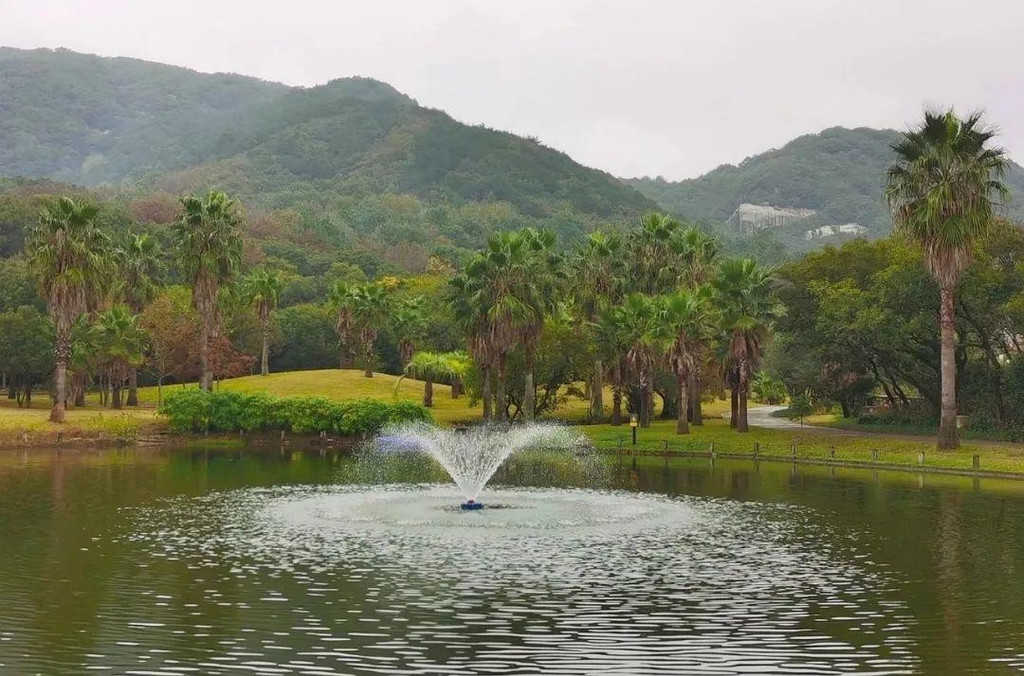 大乘禅林前往法雨禅寺的路上经过一处水池,池中喷泉如花,池周绿意盎然,秋意浓艳,景色如画。