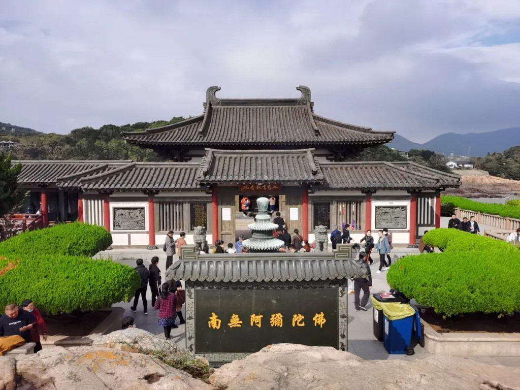 普陀山由南向北分为紫竹林景区、南天门景区、西天景区、普济寺景区、法雨寺景区、梵音洞景区、佛顶山景区和宝陀讲寺景区,此外还有一座珞珈山岛孤浮普陀岛之东。我住的地方离普济寺景区最近,先去普济禅寺看看。