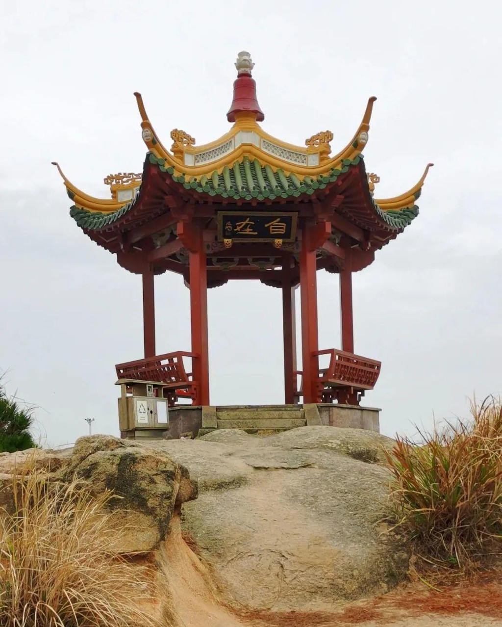 灌木小道的远方一座小亭立在碧海蓝天间,小亭下聚着不少人,那里应该有奇景。