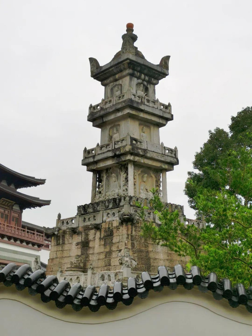穿过定香亭往前,一座白塔赫然眼前,此为普陀山多宝塔,又称“太子塔”。多宝塔是普陀山唯一保持原貌的最古老的建筑,与法雨寺中明朝南京故宫惟一存世的宫殿建筑九龙殿、杨枝庵中根据初唐画家阎立本绘的观音画像刻成的杨枝观音碑以及佛顶山上稀世物种鹅耳枥树,合称为“普陀四宝”。