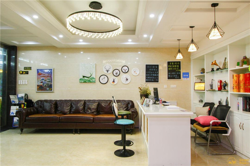 进入大厅是一派温馨现代风,绿植、暖灯、元素装饰品,样样别具格调,一侧墙边的小小吧台、高脚凳、沙发、电视机供客人闲时偶作休憩,分外居家。
