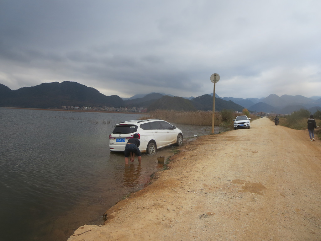 目测湖面大约有两公里宽,沙堤上,停着不少车,大多数是来钓鱼的,也有的,将车停在水边冲洗。
