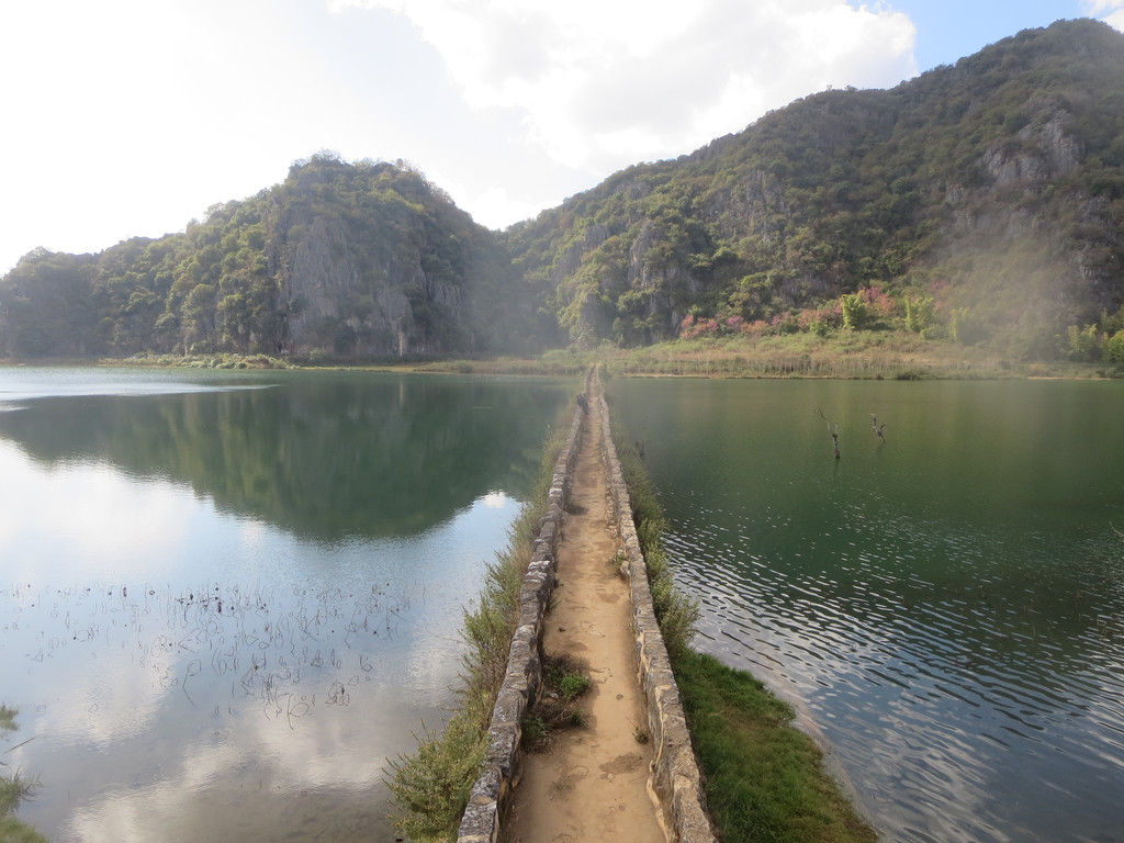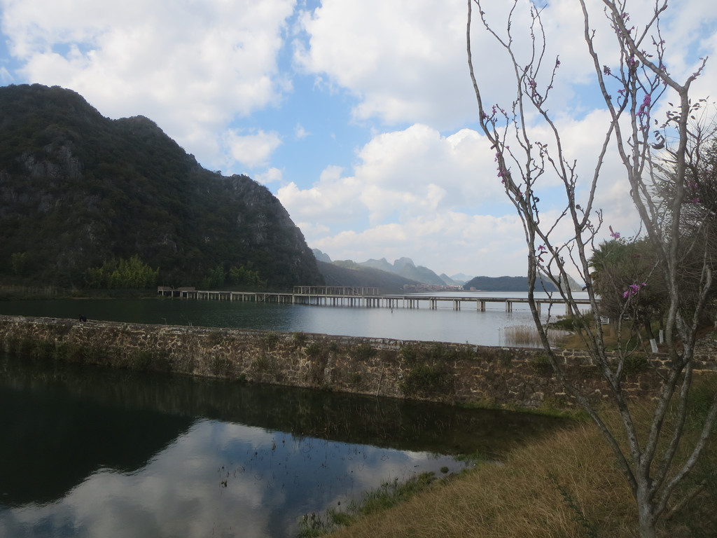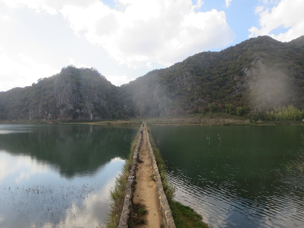 桥背水,既是渡槽也是桥,露出水面约三米,石头砌成,但实际上只有枯水的时候人才能在渡槽上走,有心上去,但我们在上面下不去,下去的话也很难爬,不过有两个人在渡槽上钓鱼。