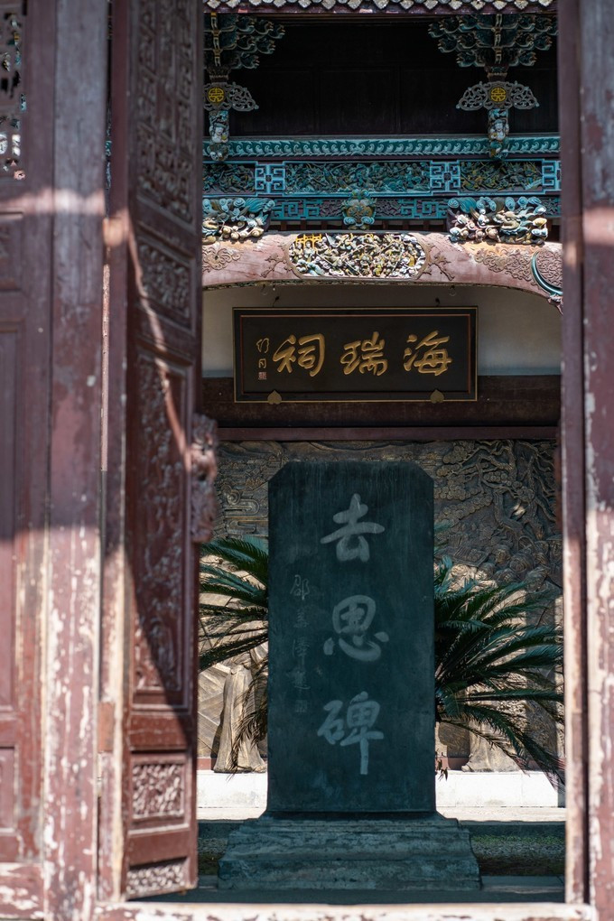厅堂正中下对大门竖着的那块碑,便是闻名遐迩的“去思碑”。“去思”就是说海瑞离任,辞别当地百姓而去了,但老百姓一直都在思念着他。关于这块碑的历史,可以追溯到明嘉靖四十年(1561年),这一年海瑞正好在 淳安 的任职期满,在离任前往 嘉兴 的途中, 淳安 的父老乡亲纷纷前来夹道送行,百姓们还委托 淳安 进士徐廷绶为海瑞写了《去思碑论》,并竖碑题刻“去思碑”,以怀念。明代的去思碑已被淹没,现在的是重新竖立的去思碑,字体是原人民日报社长邵华泽先生题写的。