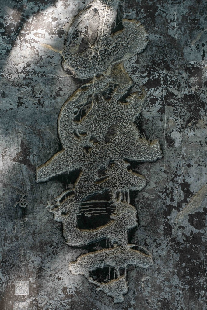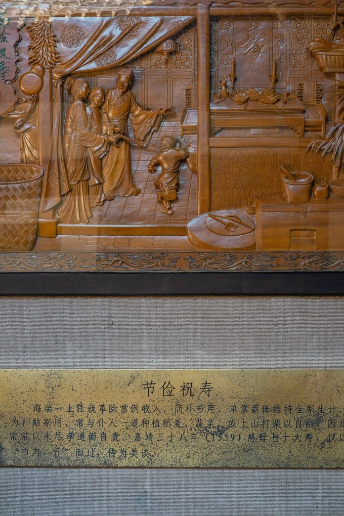 这是一个别具风韵的狂草“寿”字,据民间传言,此寿字由“生、母、七、十”四个字组成,《明史-海瑞传》海瑞在任 淳安 知县次年“为母寿,市肉二斤”的记载。因此不论从字形、笔划,此寿字系海瑞生母七十寿庆之时所书。另外,此“寿”字倒过来看,还是一个“寿”字。在导游小姐姐的引导下,我们还看见了字体间的神奇所在,寿字里面真套了一个母亲的母字,就在下半部分寸那个地方,你仔细看就能看到,从此字,可见海瑞书法之扎实、技艺之高超,让我们佩服极了。又是才子,又是孝子,还是清官,这样的人才太难得了!
