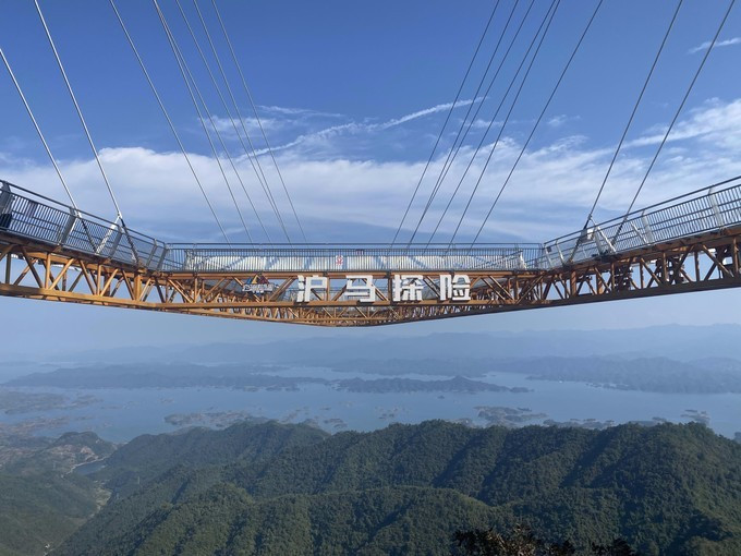 TOP2玻璃悬挑景观台:来沪马探险乐园必打卡地。名副其实的世界第一空中悬廊,景观台悬挑108米,比现有世界吉 尼斯 记录保持者长40余米,位于千岛湖周边最高峰金山尖顶,海拔高度800余米,是千岛湖的最佳摄影点。整个景观台由钢结构焊接而成,观景台台面使用三层钢化夹胶玻璃制成,单块玻璃承重高达1吨,游客可720°全景式俯瞰千岛湖美景。