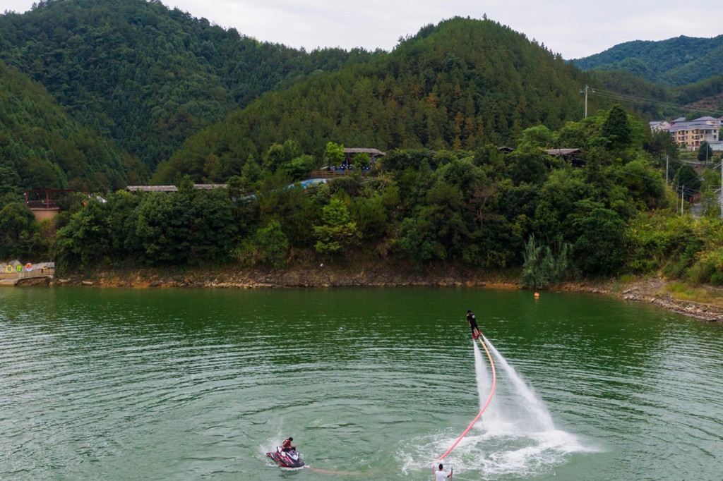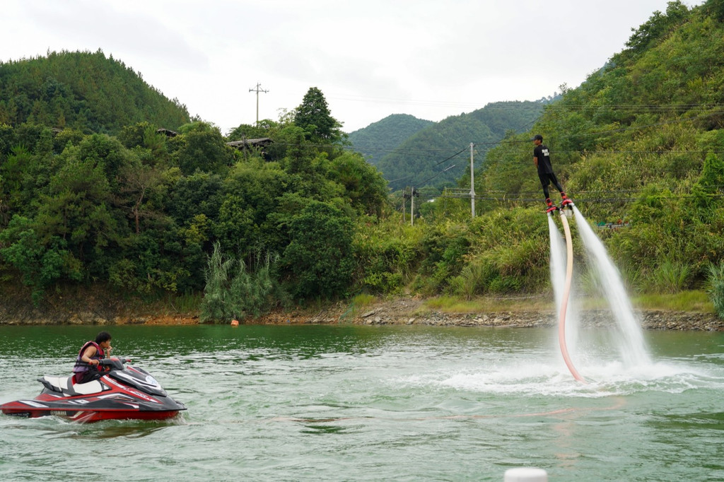 通过向下喷射高压水柱的方式将体验者带到空中,完成一系列水上动作,体验腾空在水面之上的刺激。这个项目也是有教练带领玩耍的。
