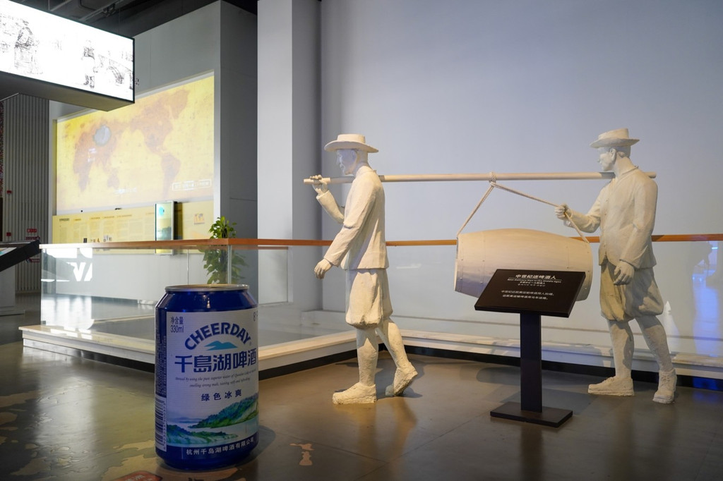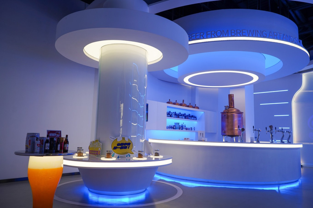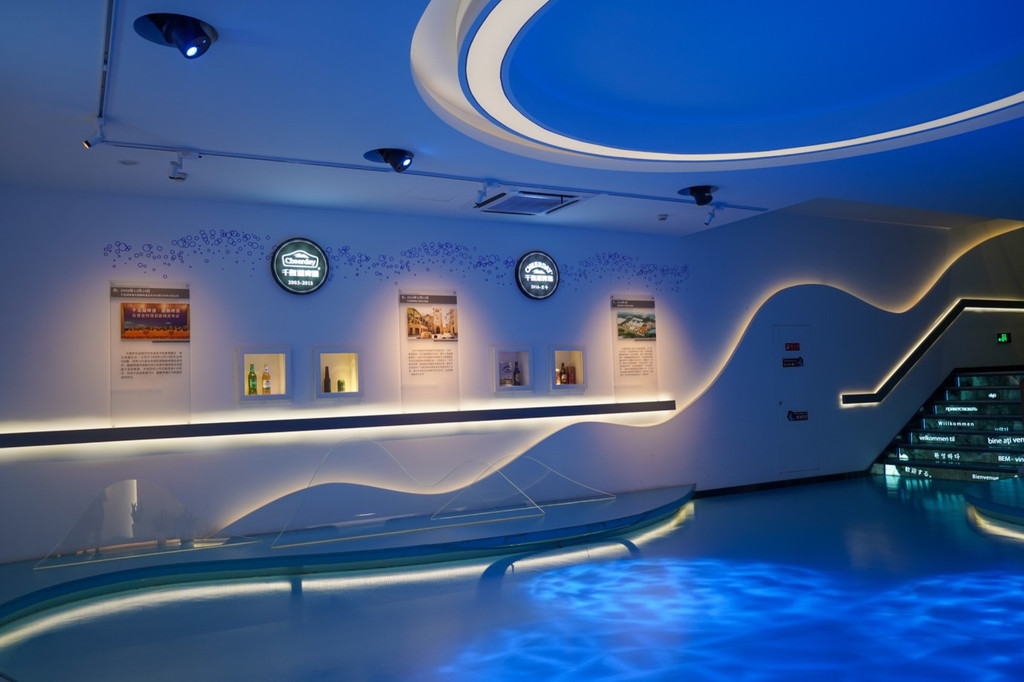 游客接待大厅1序厅、水波纹GRG设计、纯铜打造精酿五器组合、 新安 移民文化、千岛湖啤酒历史。
