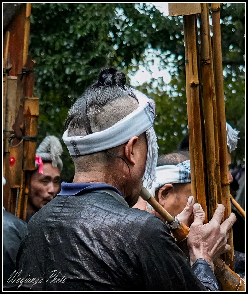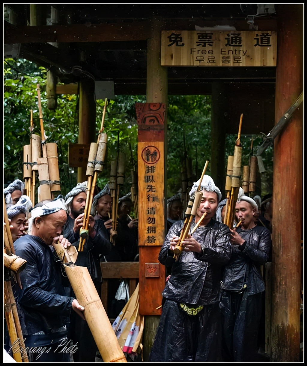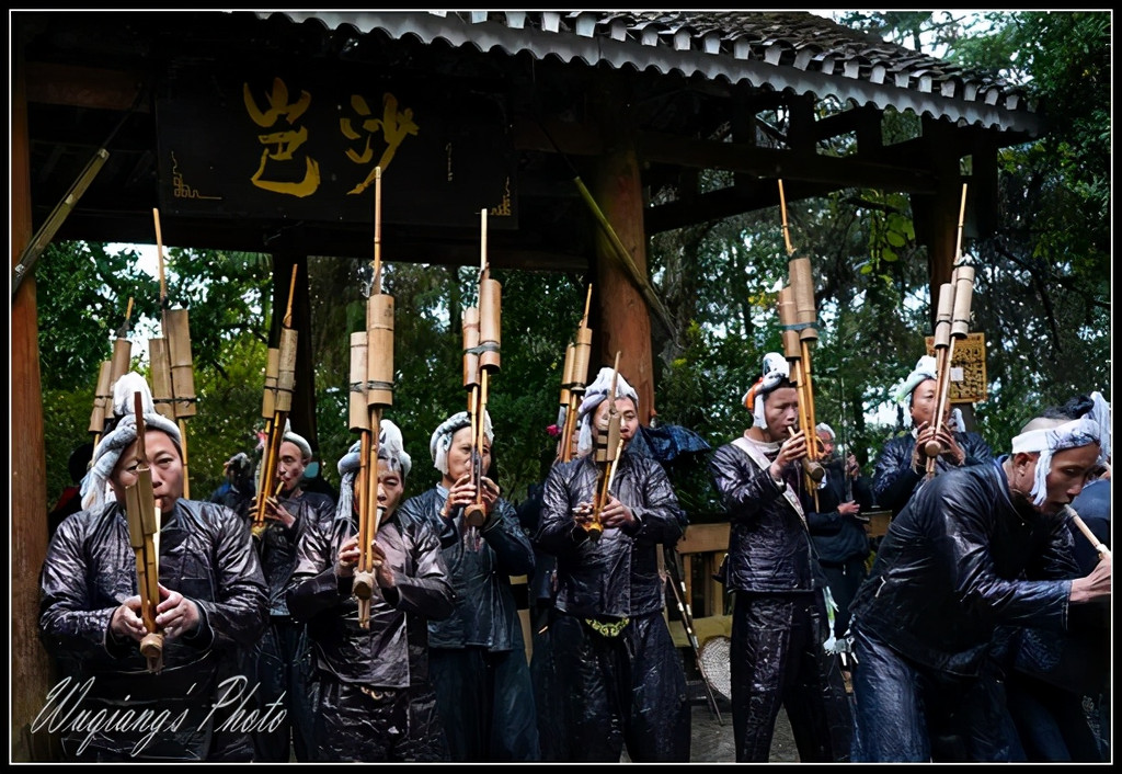 岜沙男人们用竹子制作成各种形状演奏的芦笙,欢迎我们入寨。