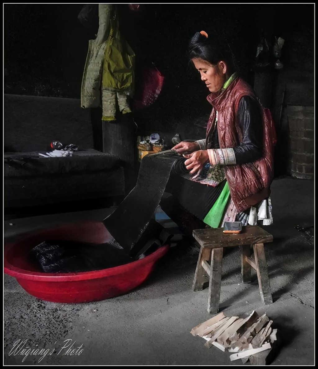 岜沙妇女们不管年龄多长,也是长发盘至头顶,梳子为妆饰插在发中。女人们多是家中的劳力,她们仍然保留着自织、自染、自制青布衣裤的手艺。中青年女性外搭短款百褶裙,精美的手工刺绣显示了岜沙女人的心灵手巧。