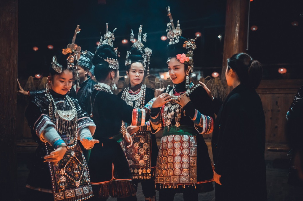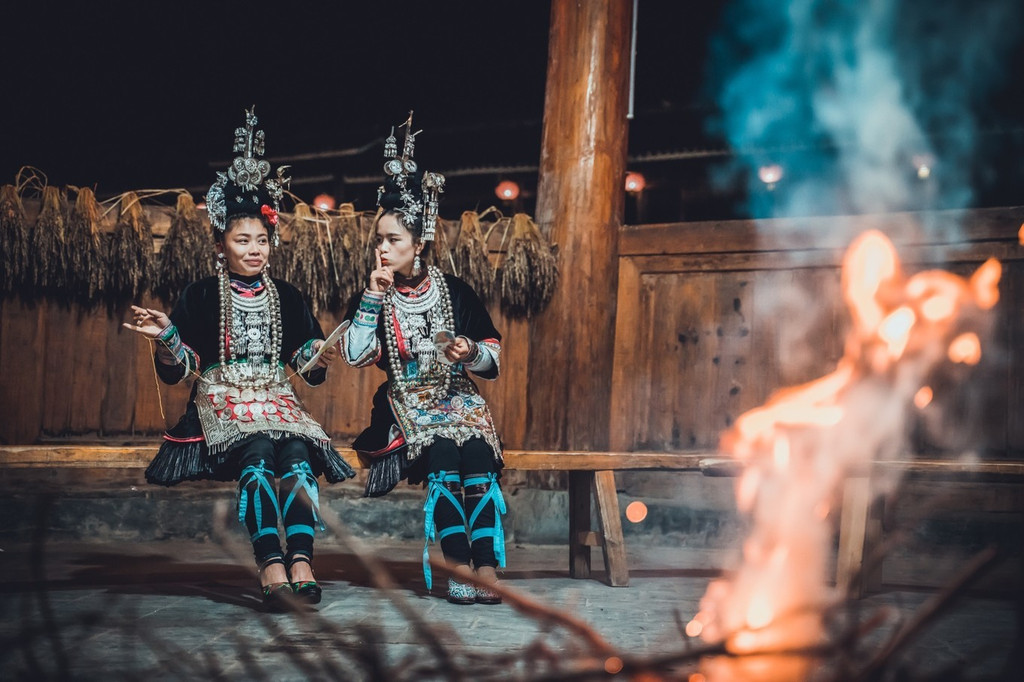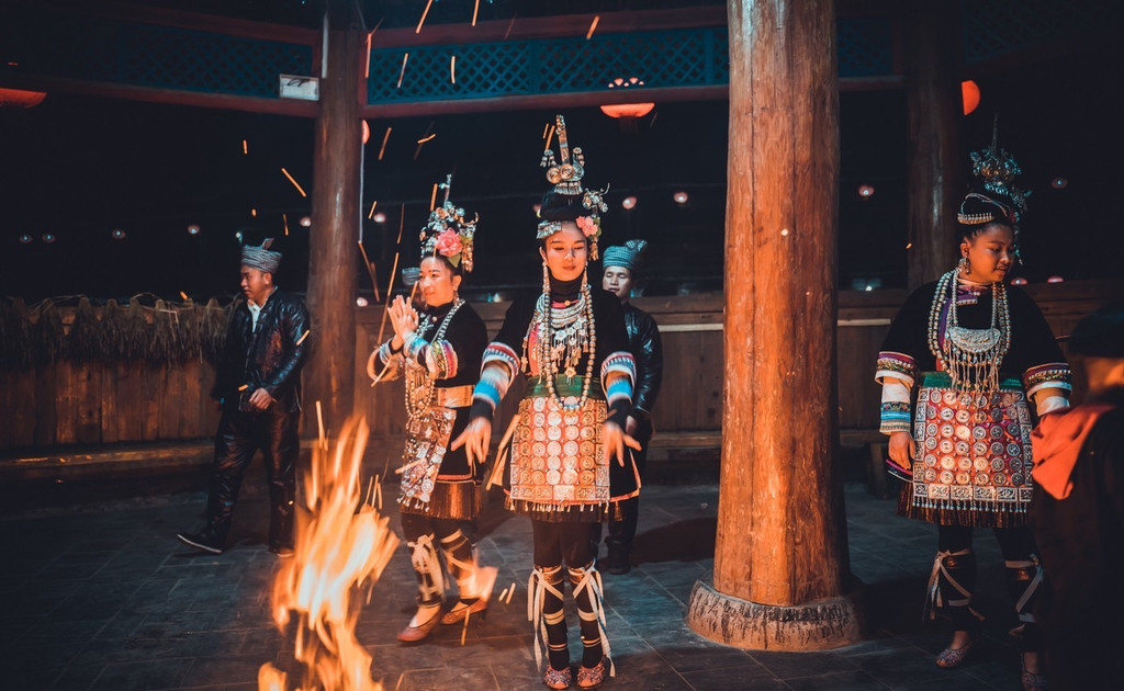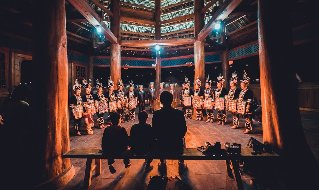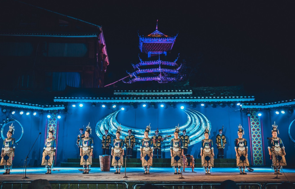 月出之时,音乐响起,侗寨的表演开始,人们或坐或站,随意自由,但演员们表演的却是认真有加,他们,白天里可能是售货员、司机、讲解员、农妇,到了夜里,他们摇身一变,登上舞台,用身姿和歌喉,诠释着侗族文化的美丽。