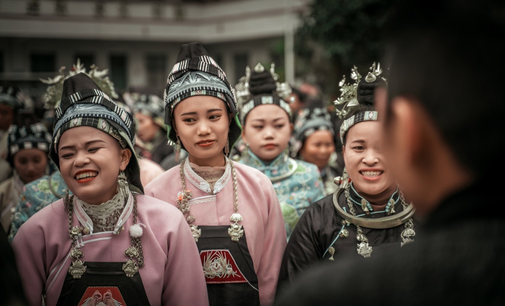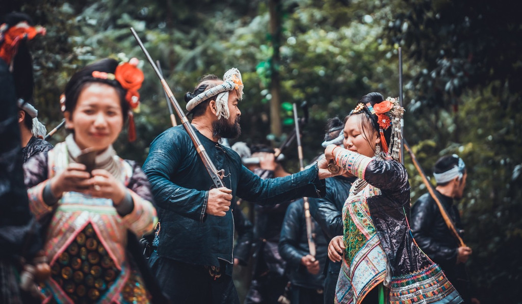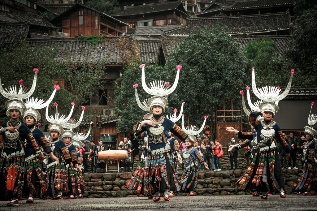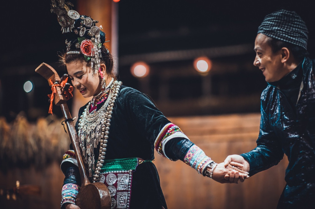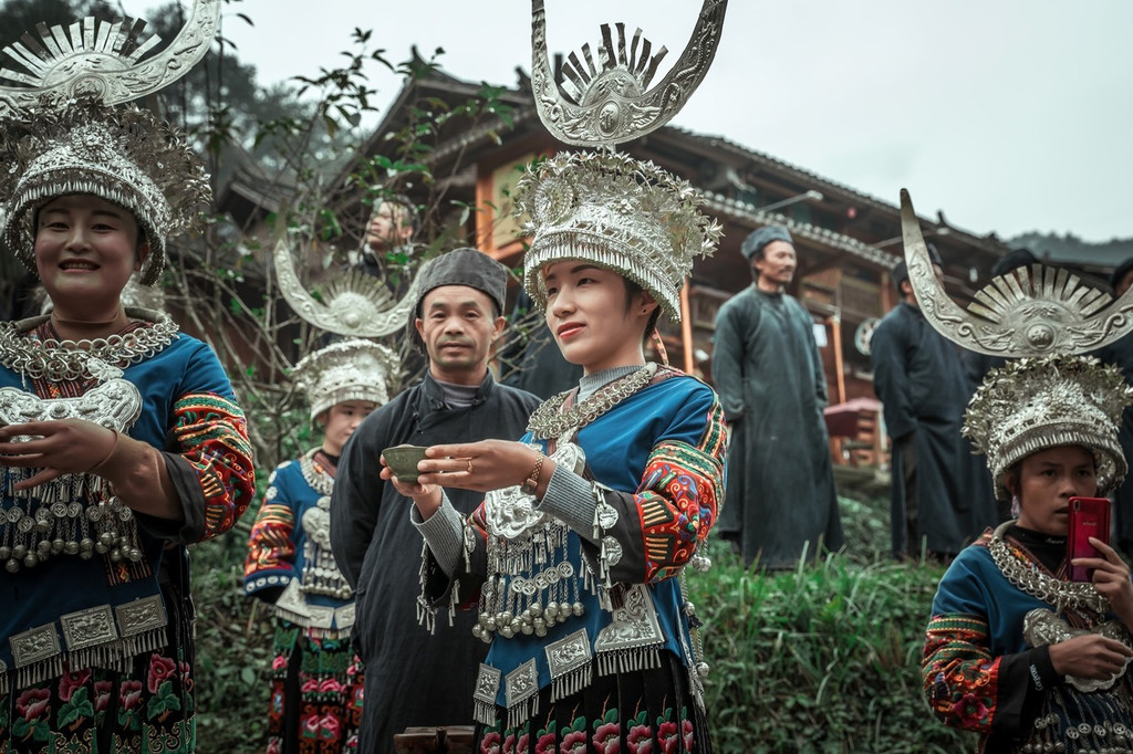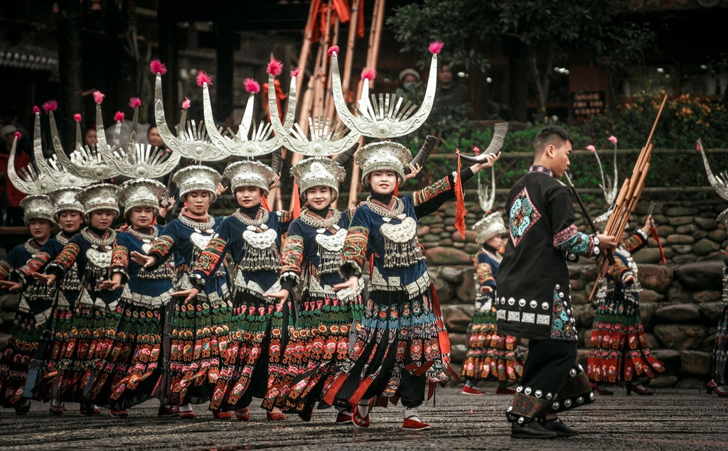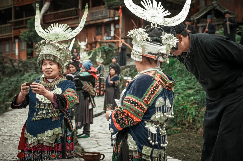 青色长衫的男人们吹响了各种竹乐打起了铜鼓,挂满银饰的姑娘们举起牛角和酒碗跳起了摆手舞。