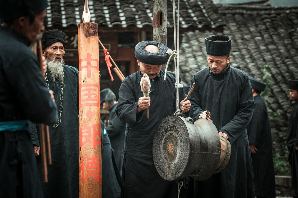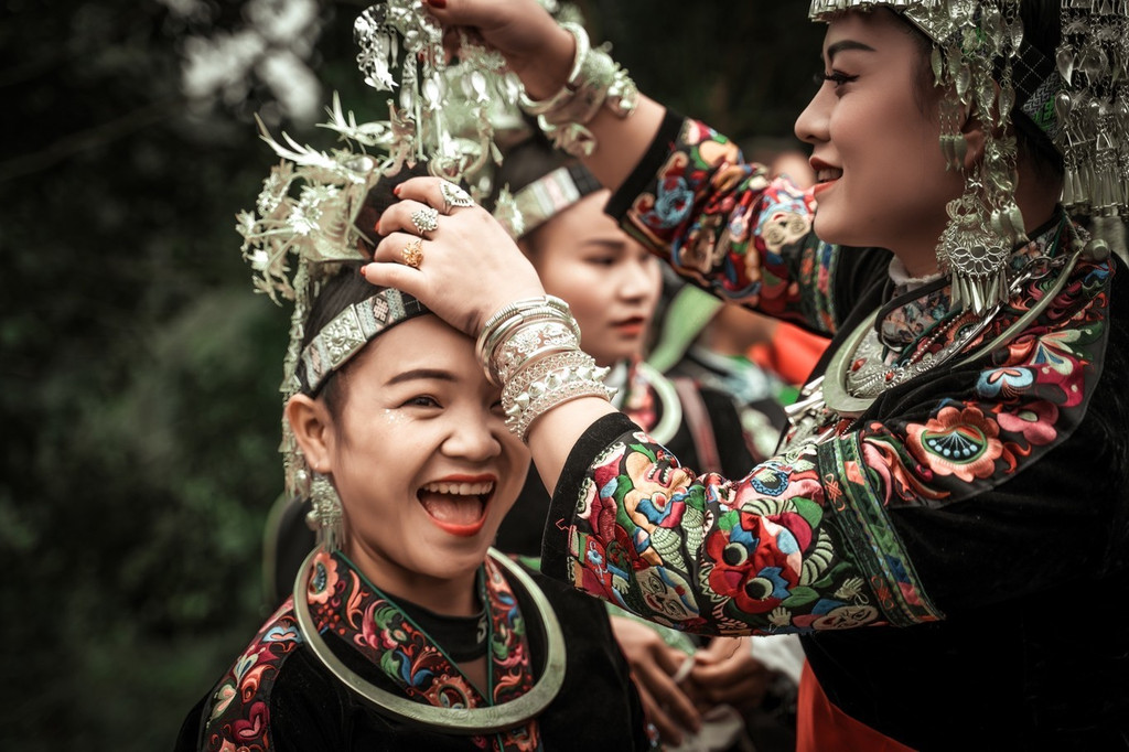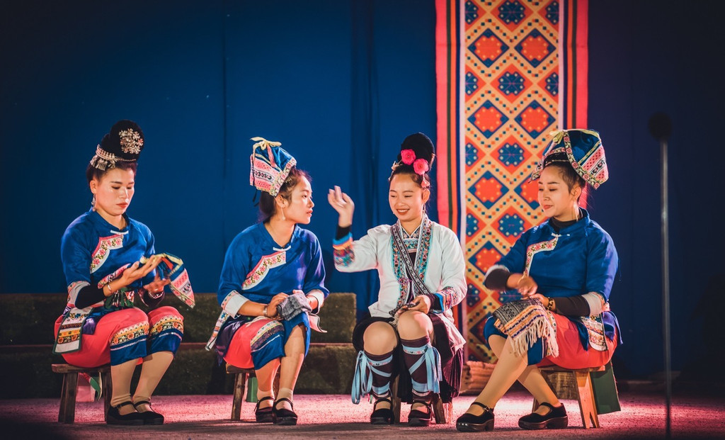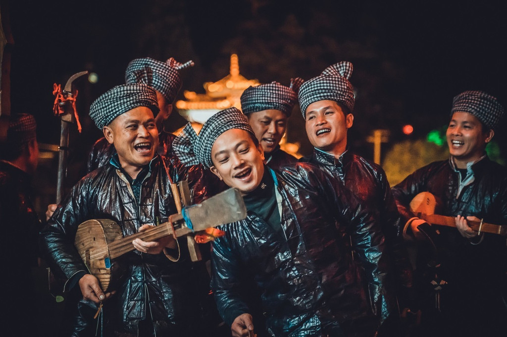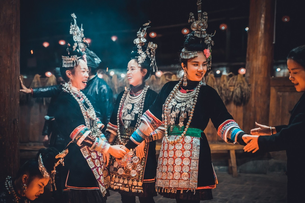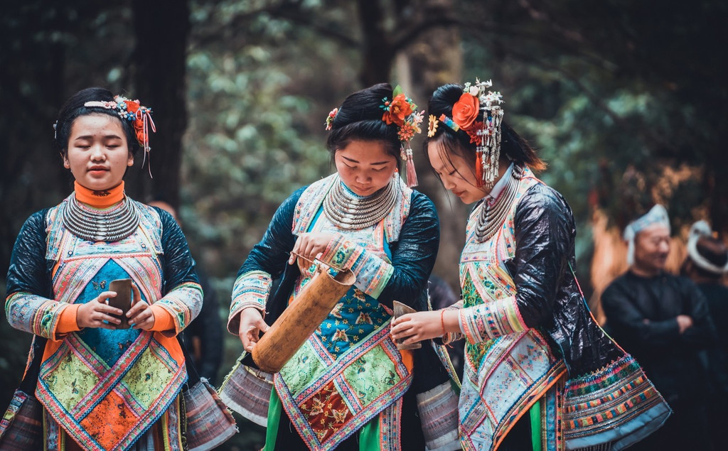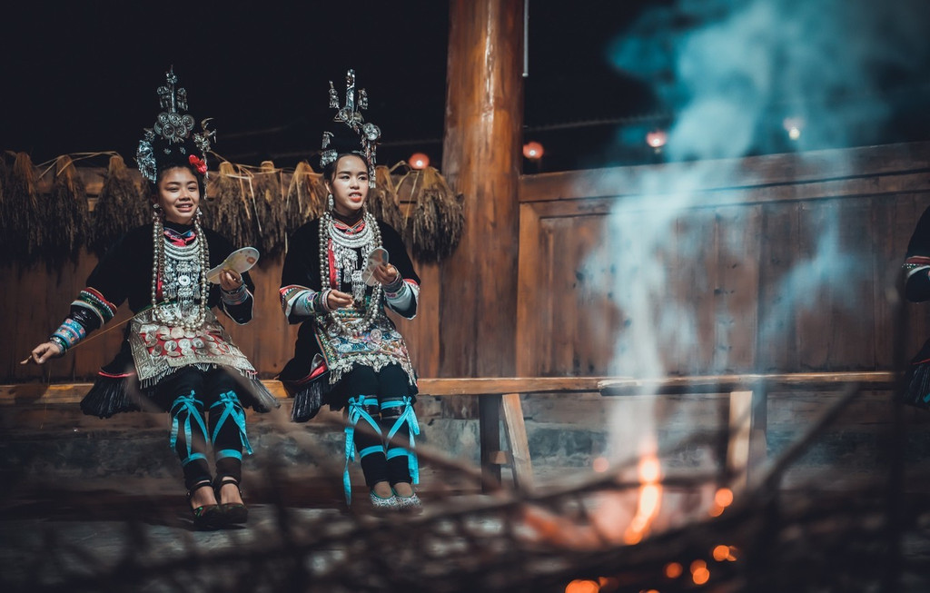 青色长衫的男人们吹响了各种竹乐打起了铜鼓,挂满银饰的姑娘们举起牛角和酒碗跳起了摆手舞。