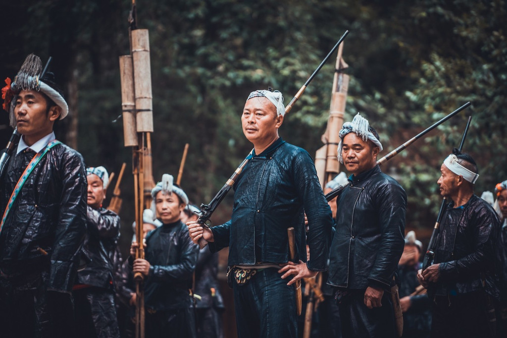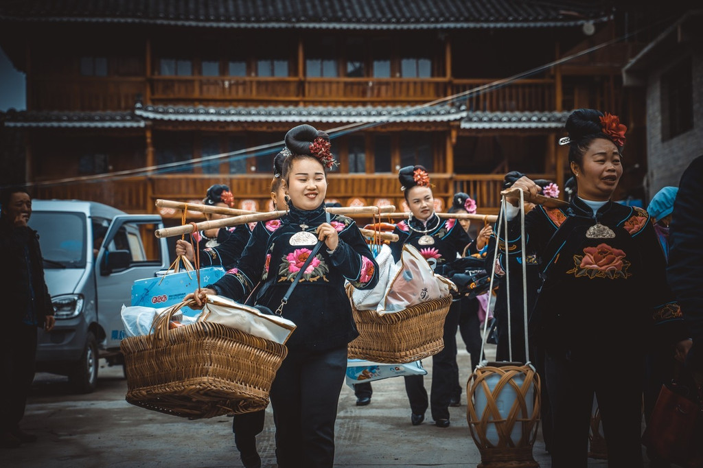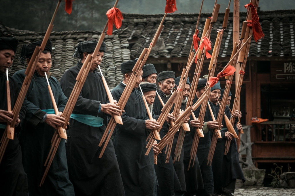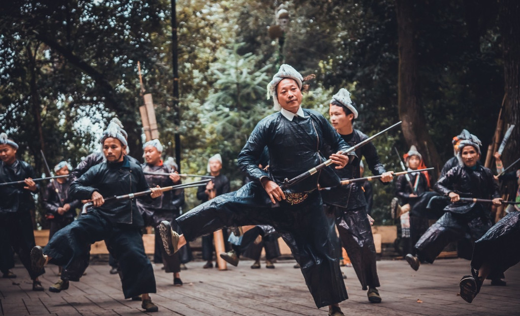 在那一座座寨门,青色长衫的男人们吹响了各种竹乐打起了铜鼓,挂满银饰的姑娘们举起牛角和酒碗跳起了摆手舞。