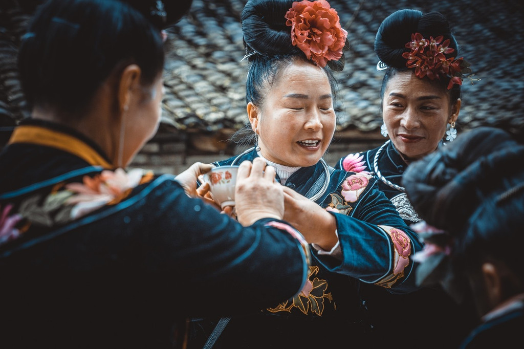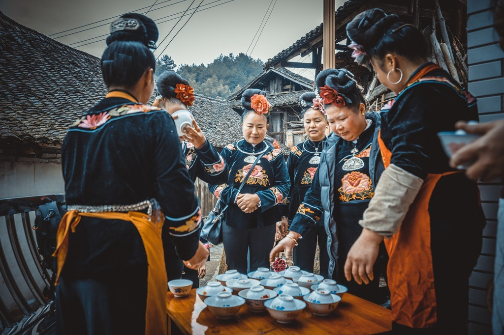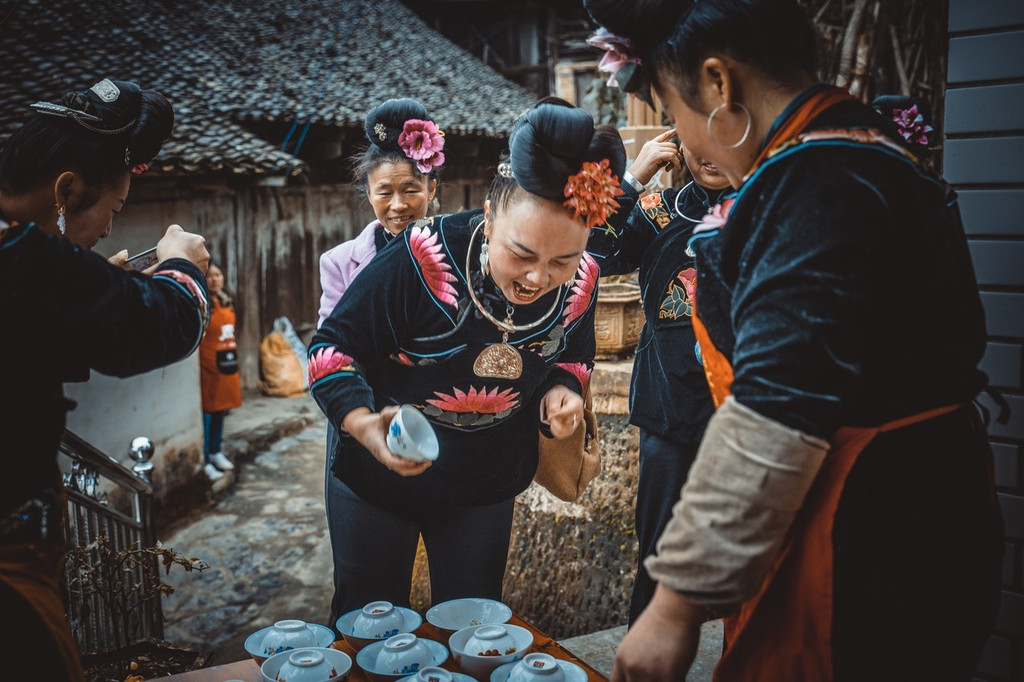 如此一路想满饮进寨者,非“海量”莫能。不过不善饮酒的客人也不必担心,只要你双手背在身后,弯腰用唇轻触酒杯即离,并有礼貌他说一声“兜社莫”(苗语“谢谢你”)就可以“过关”了。