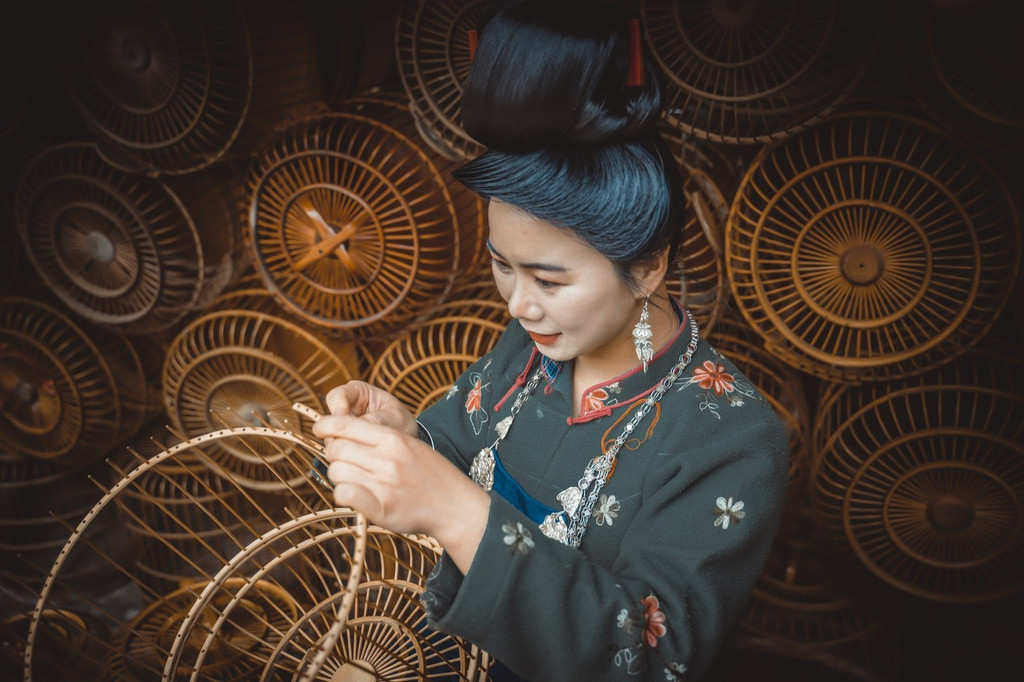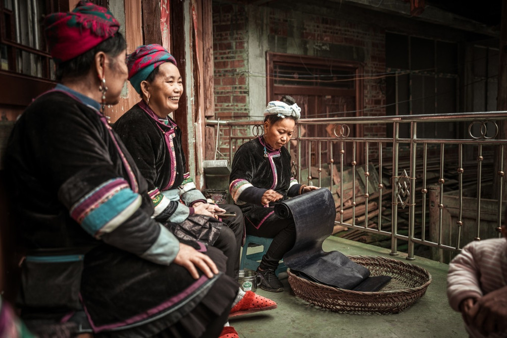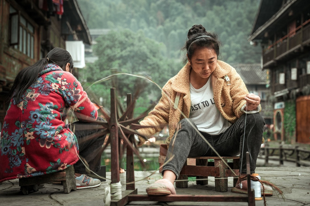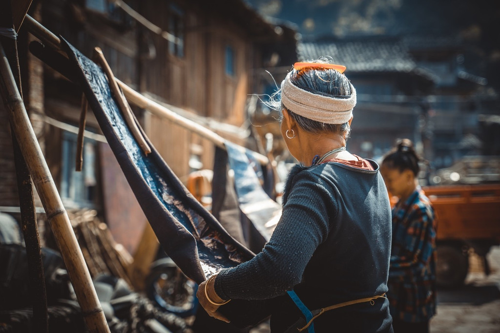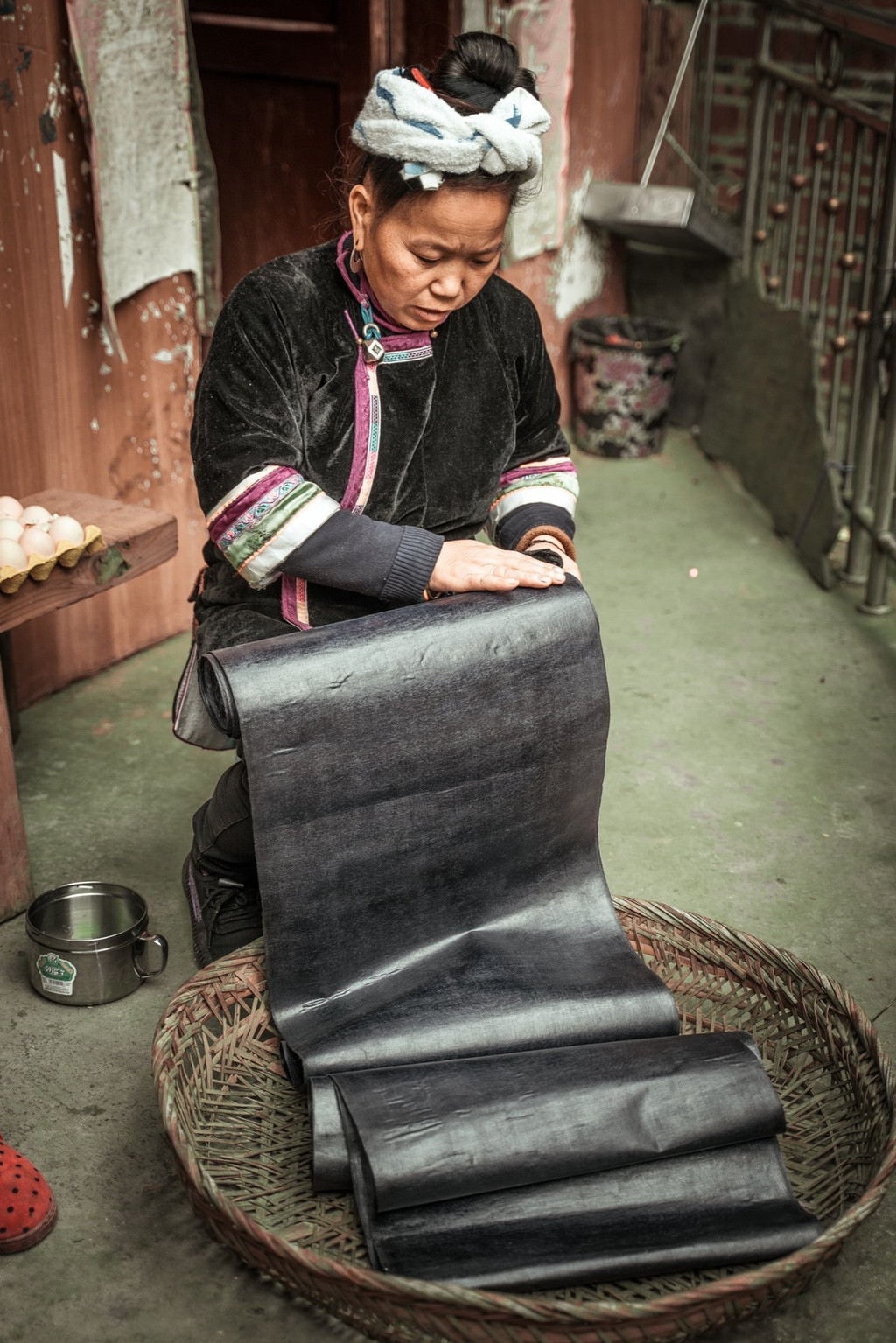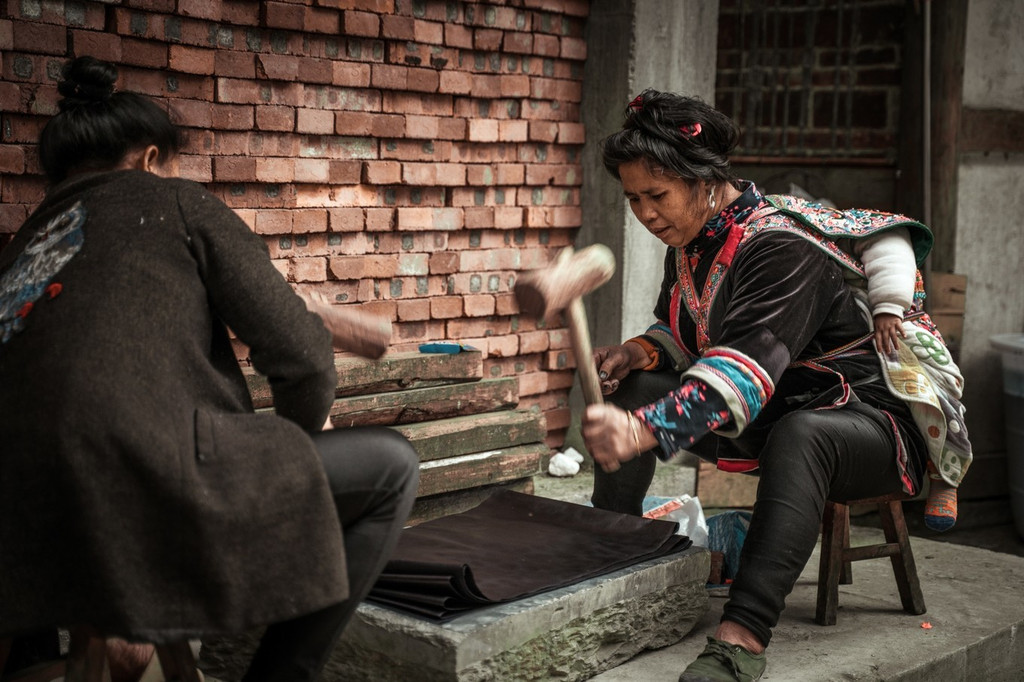 在侗寨和苗寨,都有手工制作侗锦的传统,人们使用天然原料将布料染色,晾干后涂蛋清,用木槌反复捶打,可以使布面长久保持光泽,防雨又耐脏。