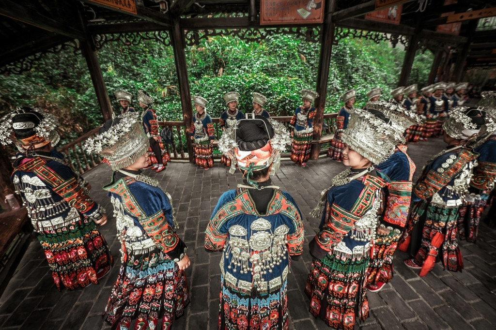 寨内苗民的服饰以长裙为特征,所以又称为“长裙苗”,色彩非常鲜艳,而在雷山县,大多数都是长裙苗