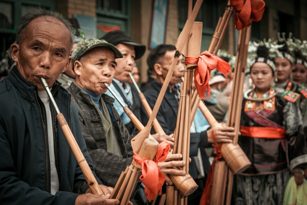 跳芦笙就是有人领吹芦笙,有人跟着芦笙旋律跳舞。吹笙者手持芦笙,一人领头,领头人吹奏着轻快的节奏,然后其它吹笙者尾随其后,步调一致走成圆圈,场面非常壮观。