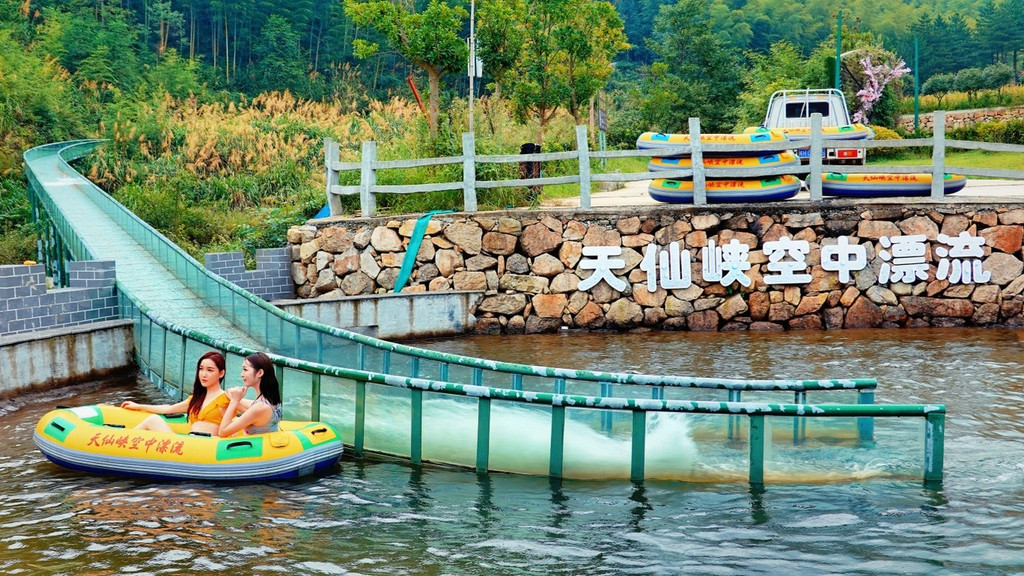 “空中漂流”,漂流由天仙瑶池出发,顺着一条长1600多米的空中玻璃隧道而下,高度落差100多米,风从耳边呼啸而过,茂密翠林的竹林萦绕于身体四周,惊险刺激而不失乐趣。
