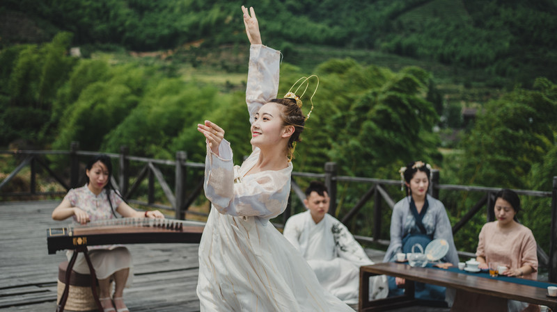 站在观景台上饮茶听奏乐舞蹈,谈笑风生,岂不快哉