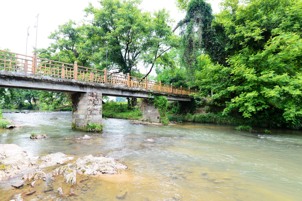 饱经风霜的虹桥爬满藤条,横跨溪岸,桥孔下溪流湍湍。