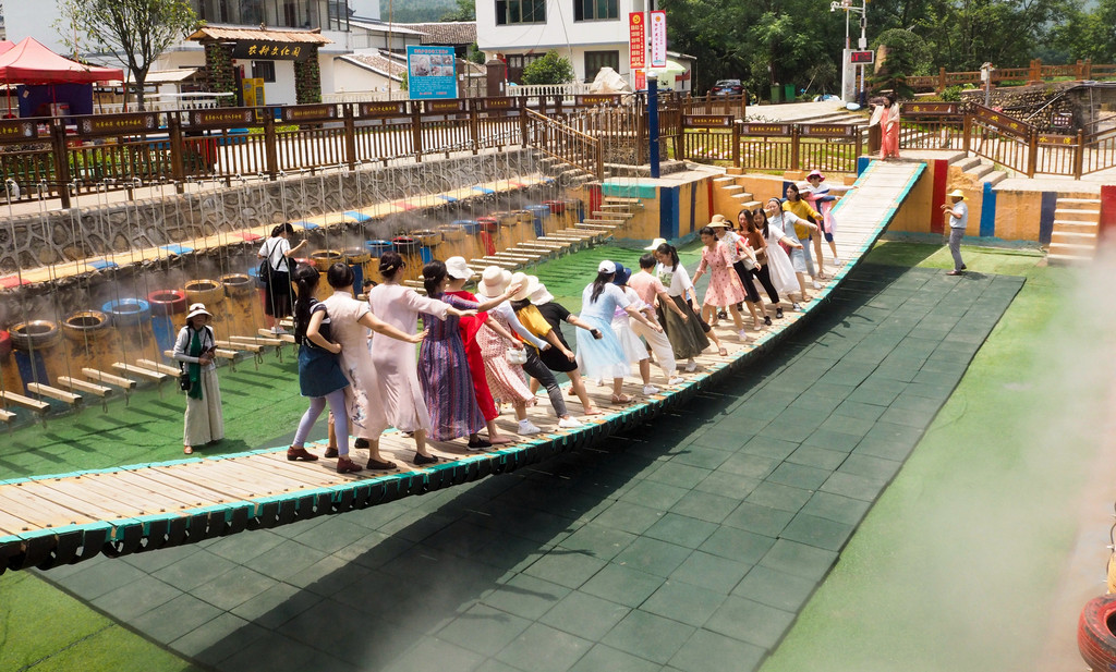 水云间的下方有个水上乐园,在水面上架了摇摆桥、步步惊心桥,你瞧,她们一起乘风破浪,玩得多欢脱,似乎还是个孩子。