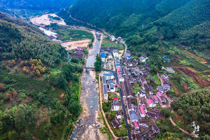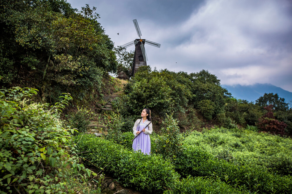 从高空俯瞰,茶园齐整,房舍俨然,山峦叠翠,草木葱绿。白色的民居覆盖着灰瓦,显出水墨画的雅致和诗意,远处的薄雾笼罩群山,宛若缥缈仙境。