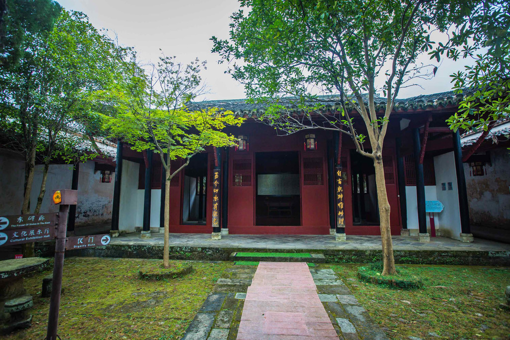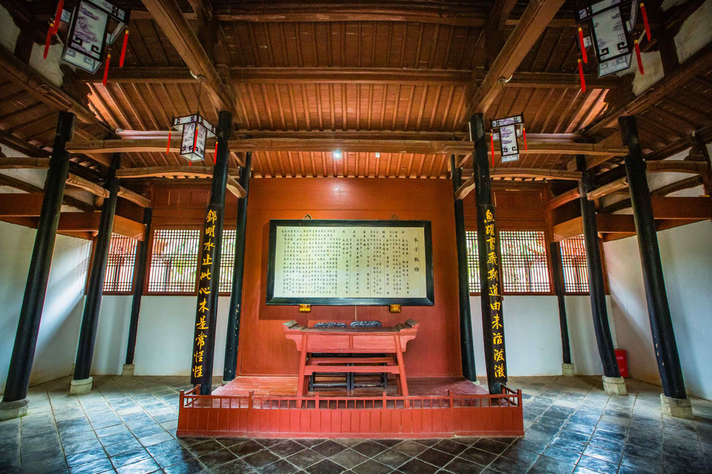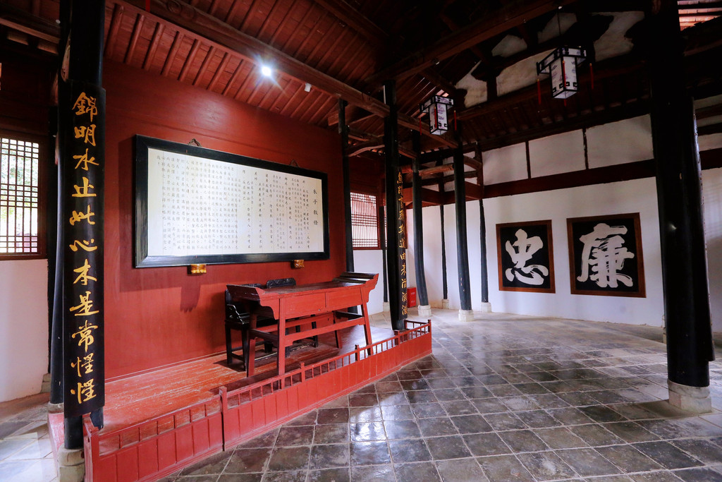 讲堂是书院传道授业解惑之所,红黑白色调为主,整体庄重简洁。最前方设有讲台,两侧壁书有“忠、孝、廉、节”四个大字,为仿朱熹字体。站在讲堂里,凝神屏气,仿佛能看到学子来往穿梭、长歌对答的身影,能听到朗朗读书声。