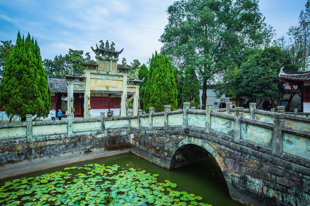 到过一些书院,发现书院的建筑规制有许多固定模式,比如它们总是和一池湖水、一座石桥配套。这桥的名字总是叫“状元桥”,状元桥也总有一样的吉祥寓意——从桥上走过,便能学业有成、金榜题名。桥下的池水碧绿幽深,不由得让人想起"荷尽已无擎雨盖,菊残犹有傲霜枝"的意境。